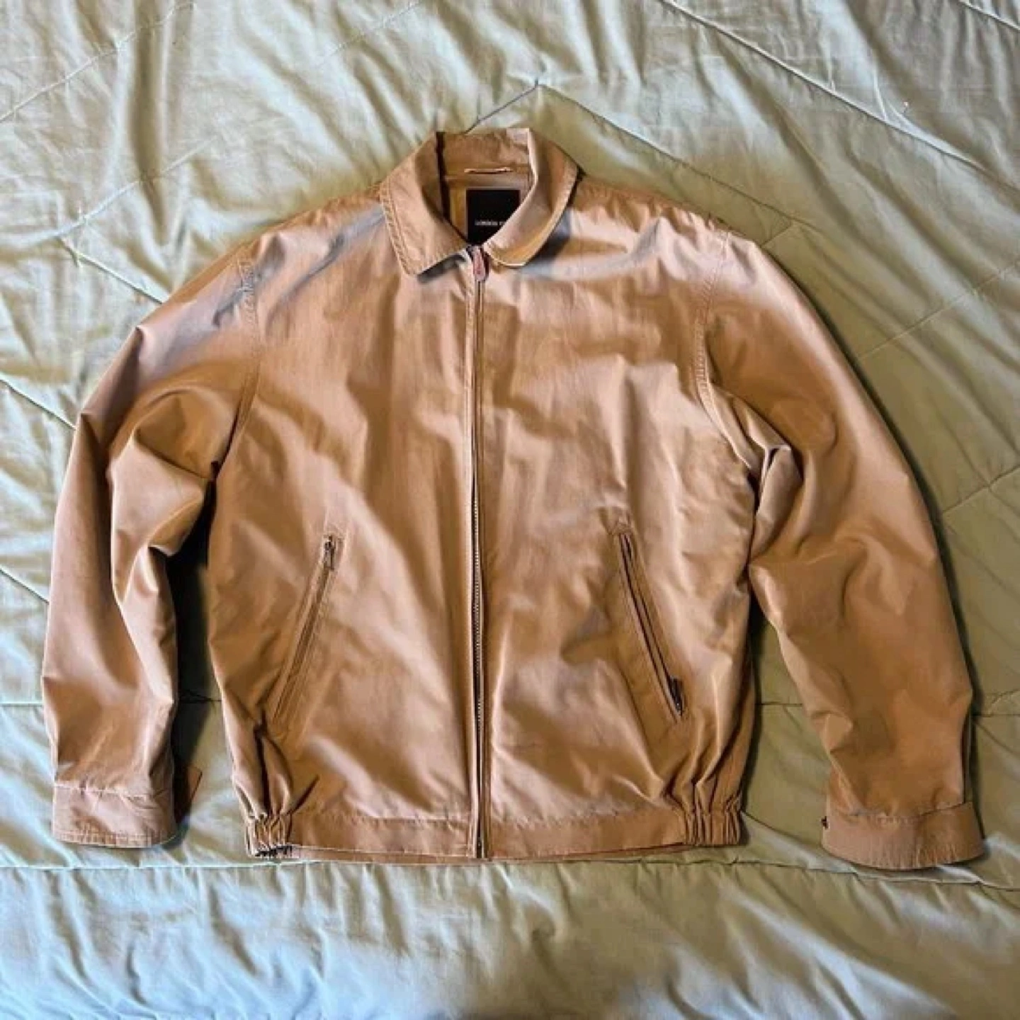 Men's light beige jacket. Full zip closure. Two front pockets. Elastic waistband. Long sleeves.