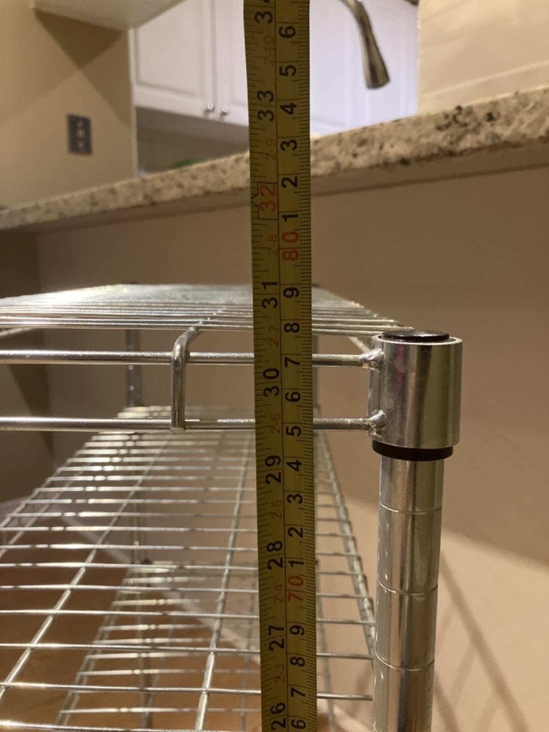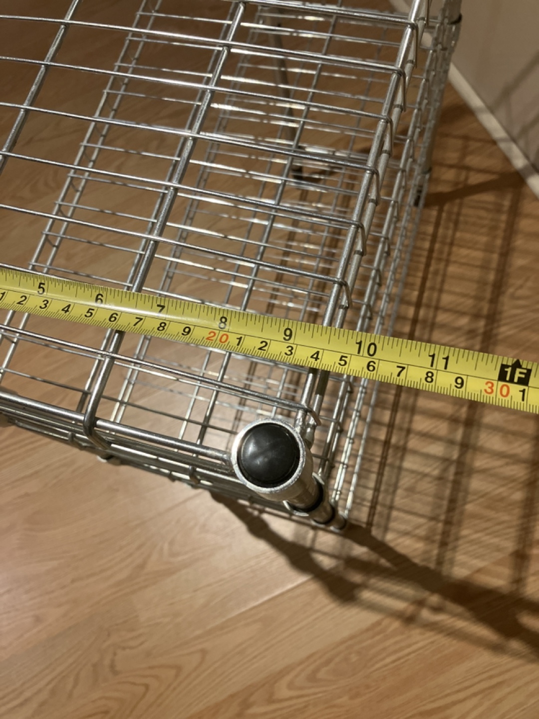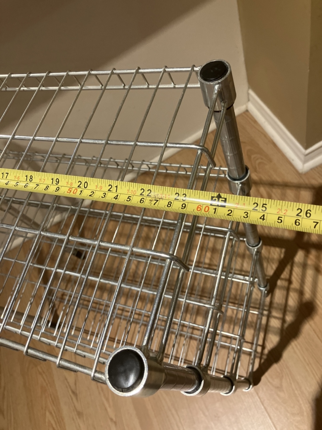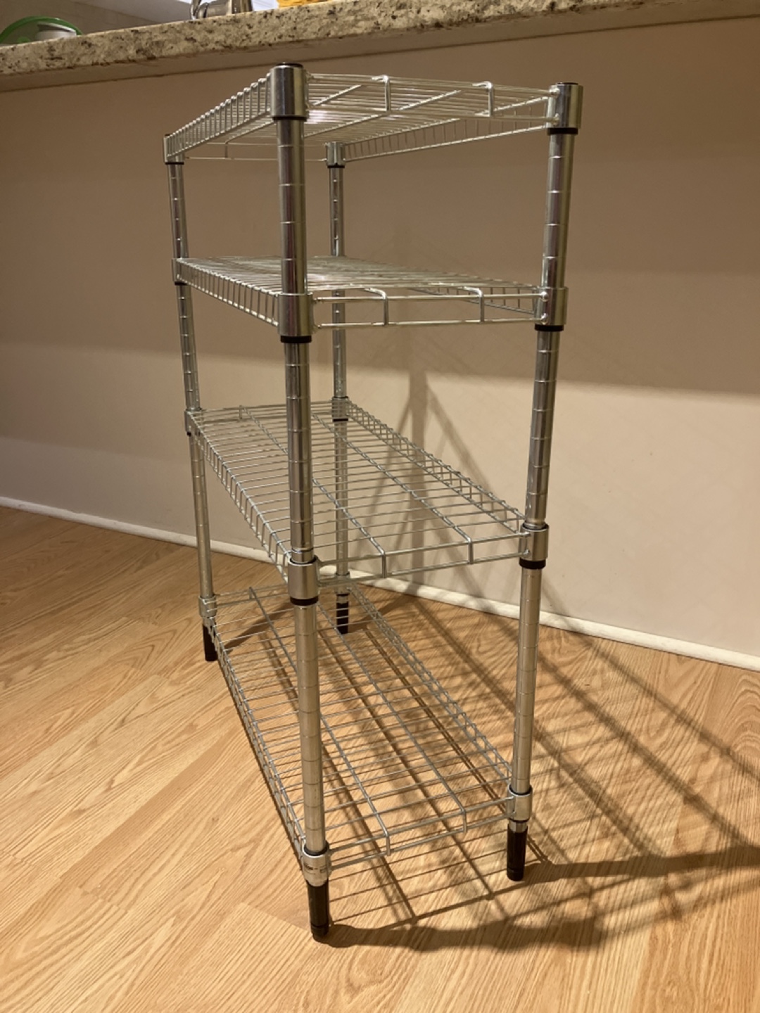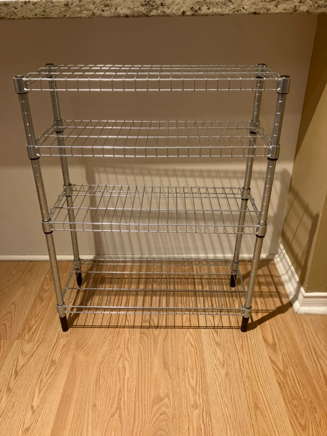 Four-tier shelving wire unit. Great for organizing various items. Indoor/ outdoor use. Dimension as shown. Is a bit wobbly but can always stick some plastic or shims when in use.