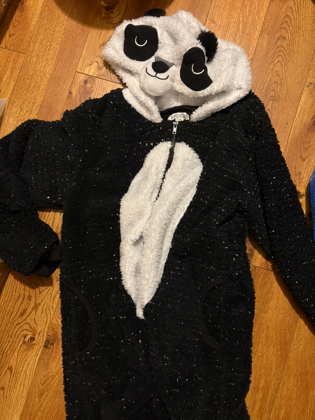 254Adorable panda onesie. Black and white. Fuzzy material. Size large/extra large. Zip-up front. Pockets. Good