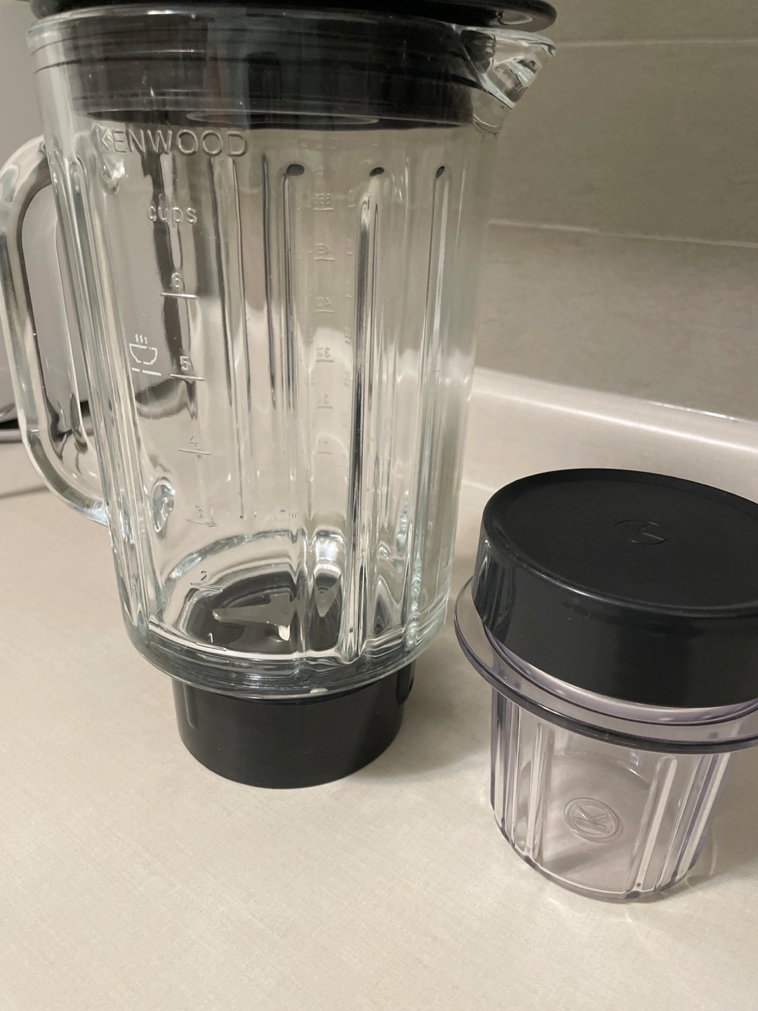 Kenwood blender jar with lid and small food processor attachment. Glass jar with measurements. Pre-owned, shows minor wear.only these parts
