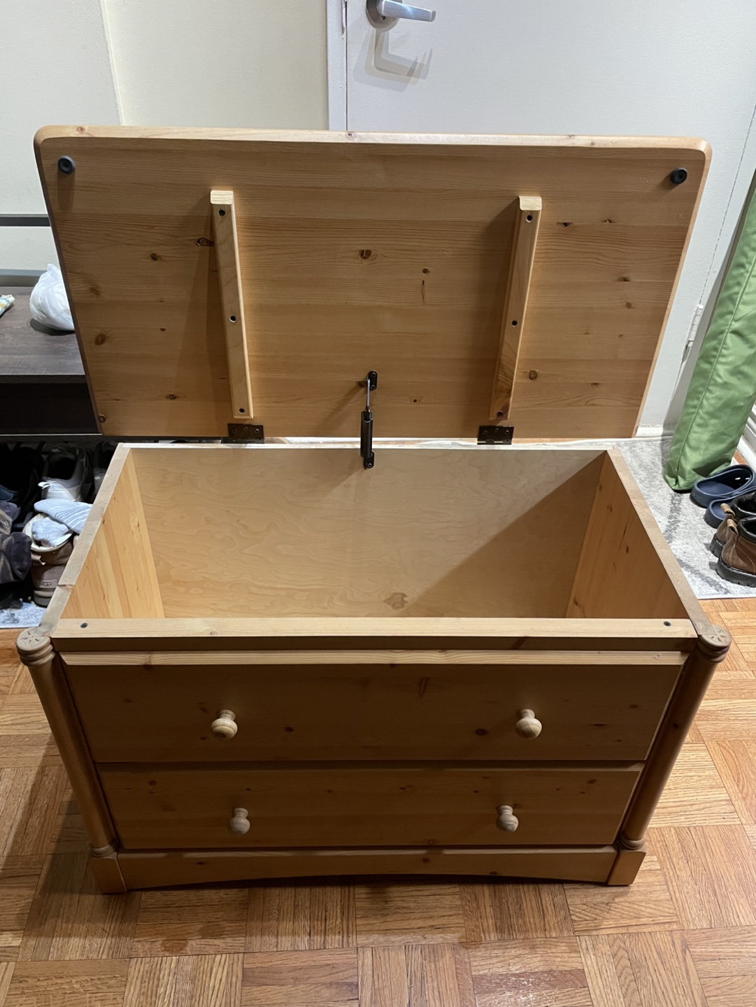 Wooden chest. Opens at the top.