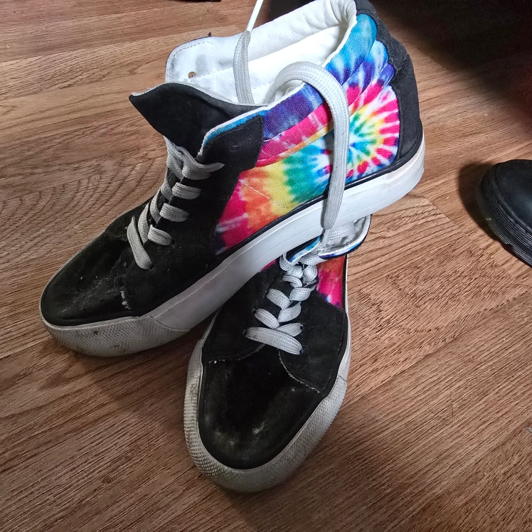 Pair of black high top platform sneakers. Tie-dye print on the back. Worn, but still wearable.