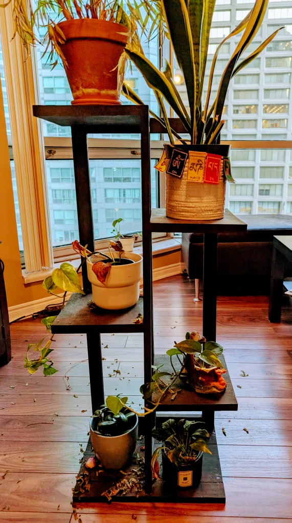 MOVING OUT SALE: Black wooden plant stand, four tiers. Some minor wear. Can hold multiple plants and decorative show-pieces. Elevates your living room instantly.