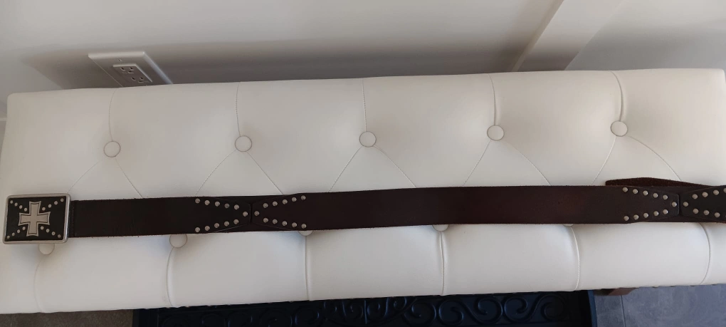 677Black leather belt. Silver-toned metal accents. Classic style.