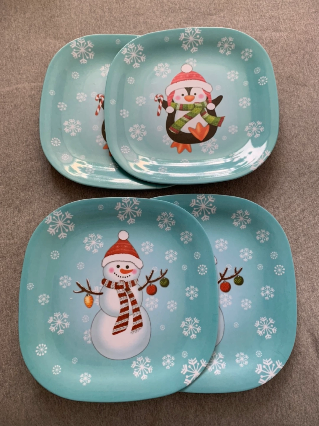 4 Christmas Plates, Penguins & Snowmen. Thick sturdy plastic