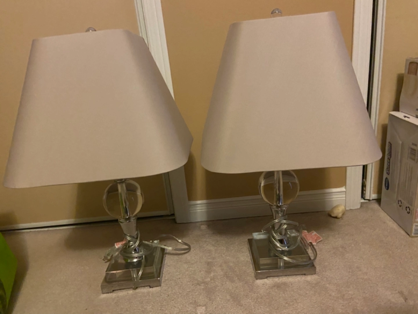74Elegant pair of table lamps. Features a chrome-coloured base and clear crystal accents. Neutral beige lampshades included. Modern design, perfect for a bedroom or living room. Paid $100 for the pair asking $60 Pick up in Georgetown