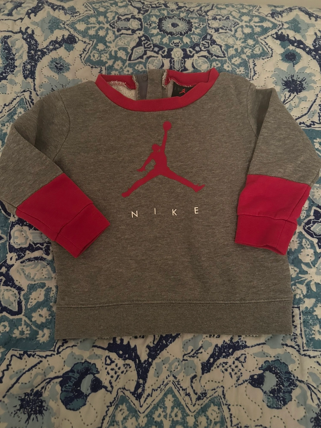 257Grey toddler sweatshirt. Features a pink Air Jordan logo and cuffs. Size 2T