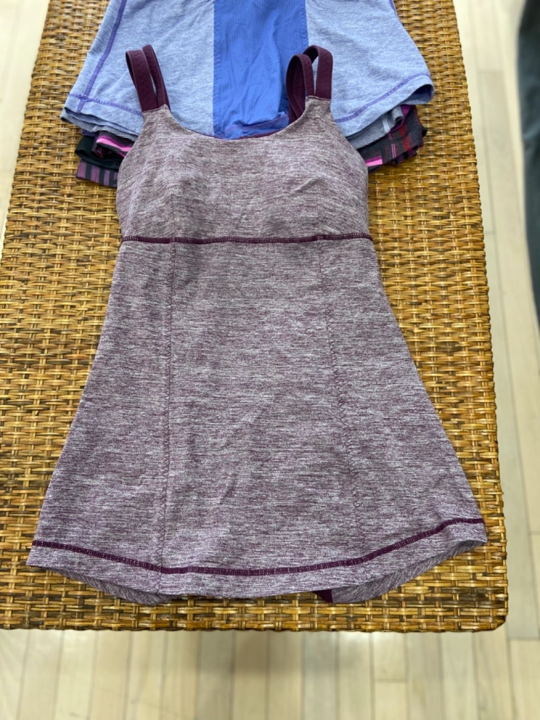 74Lululemon tank top. Purple and grey heather fabric. Strappy back detail. Great for workouts or casual wear. Size 4 No stains or holes