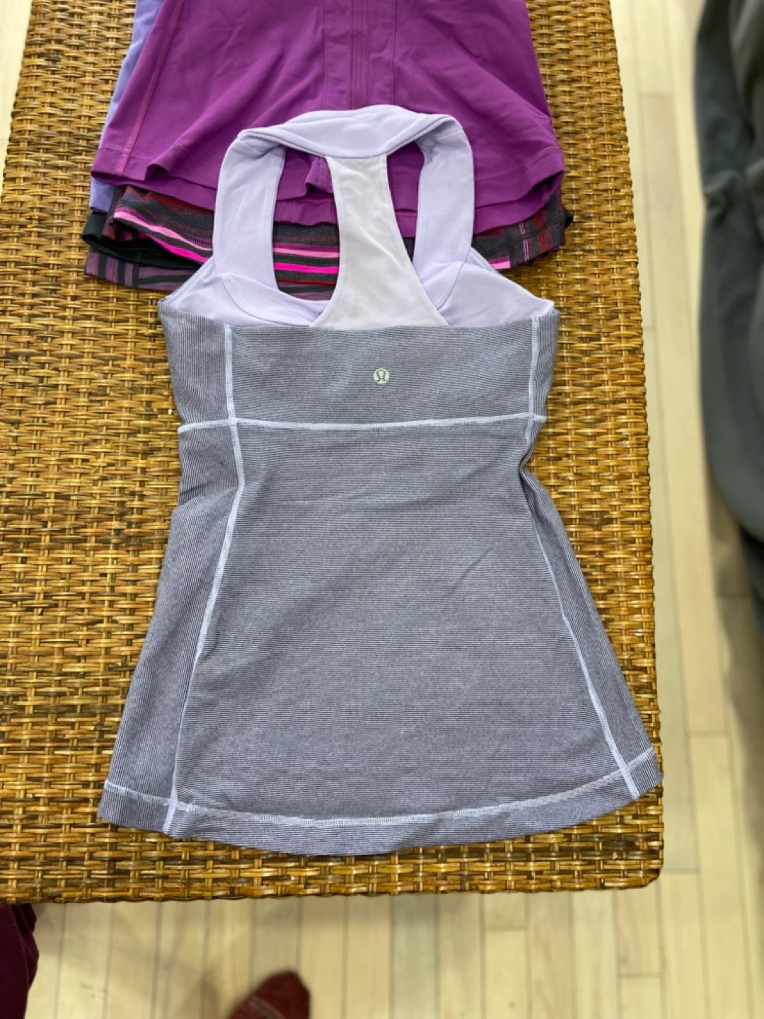 74Grey and white striped racerback tank top. Scoop neck. Great for yoga or other workouts. Pre-owned. Lightly worn condition no stains or holes Size 4 Located in Georgetown $20
