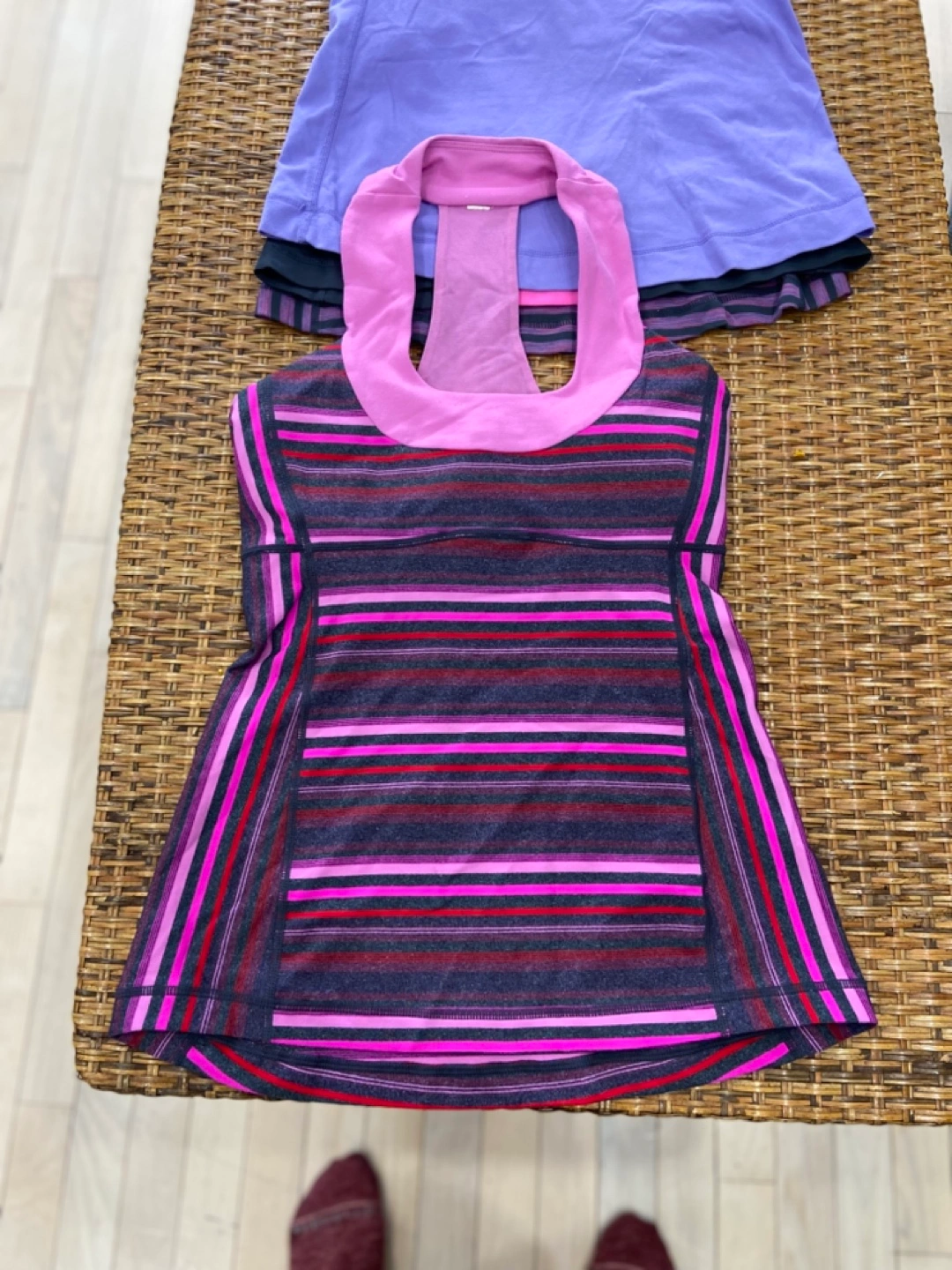 74Striped racerback tank top. Pink and purple stripes on a dark grey background. Scoop neck. Great for workouts or casual wear. No stains or holes lightly worn condition size 4 $20 located in Georgetown