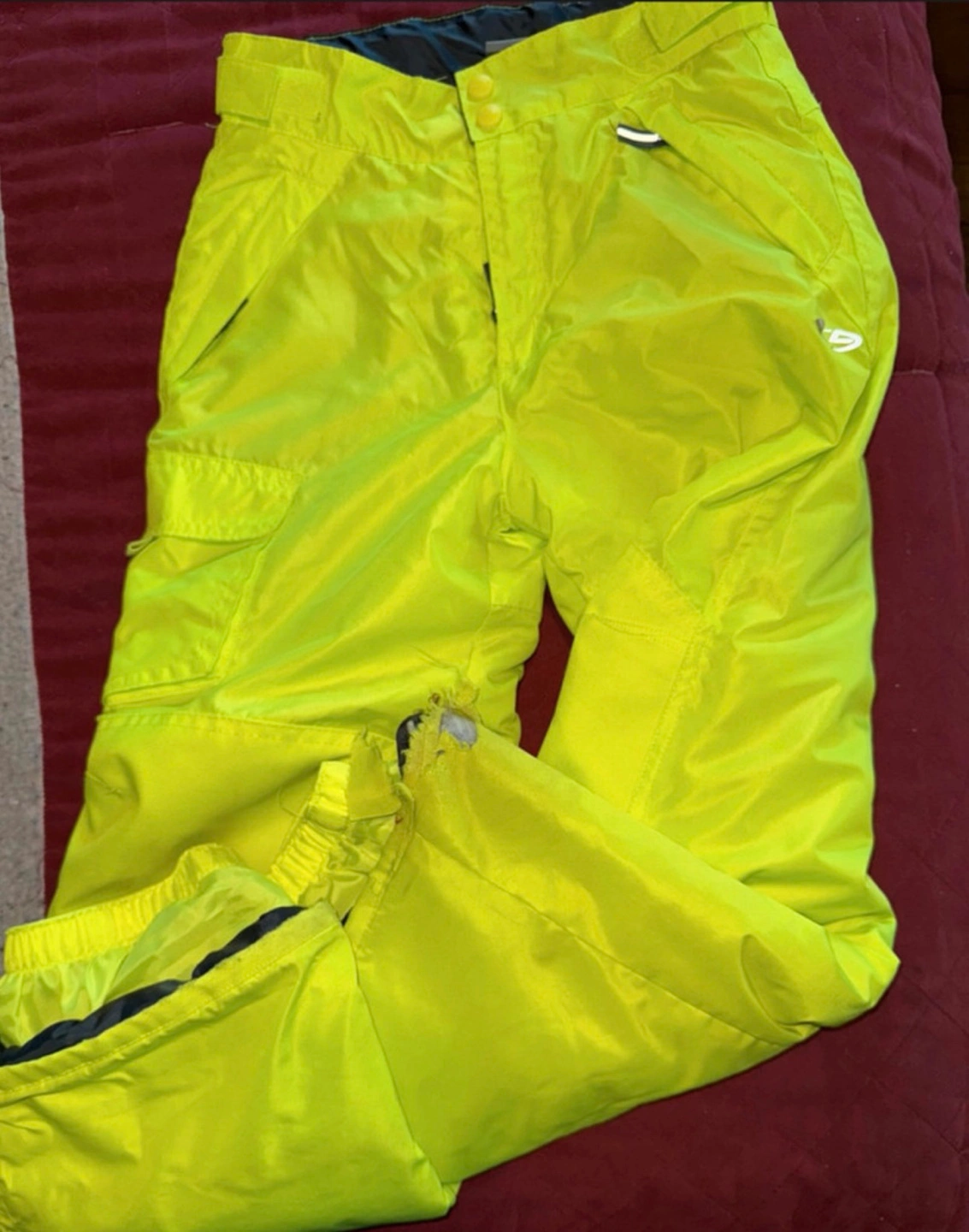 Youth size snow pants. Bright yellow colour. Small tear on one leg. Two