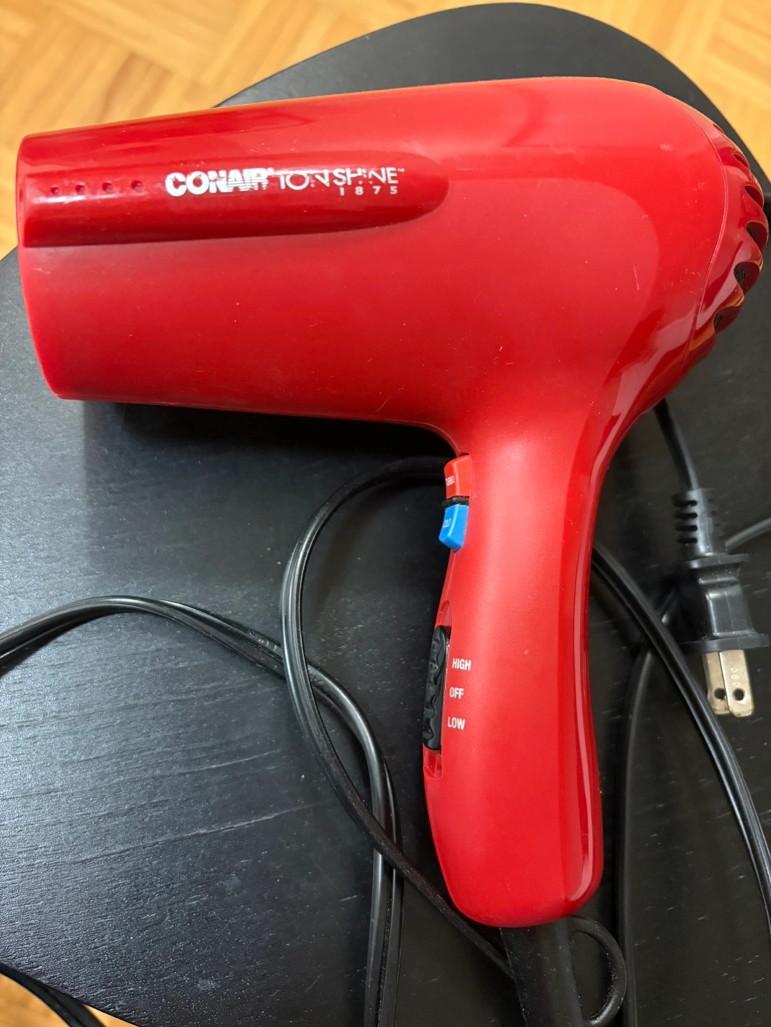 Red Conair hair dryer. 1875 IonShine. Features multiple heat and speed settings. Includes a cold shot button. Good for travel.