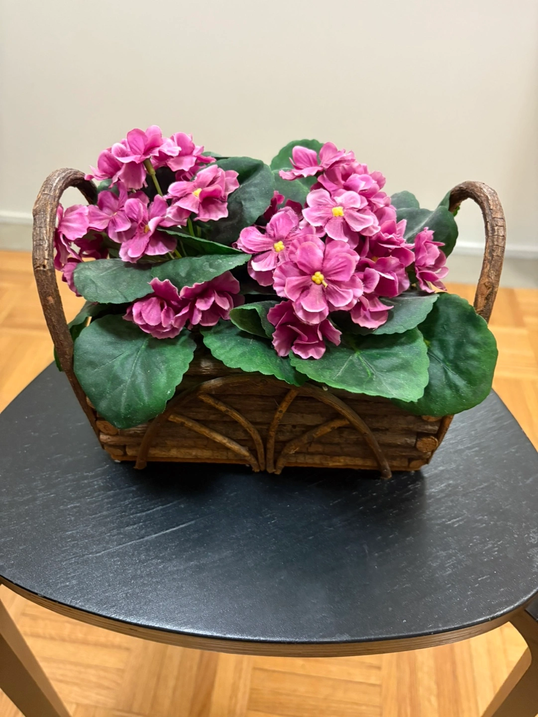 Lovely artificial purple flower arrangement. Planted in a rustic twig basket with handles. Perfect for home décor.