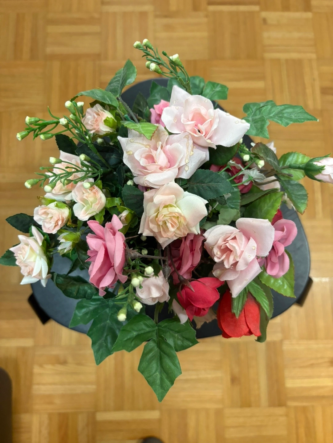 Lovely artificial flower arrangement. Pink and red roses with greenery. Small, sits well on a table. Great for décor.
