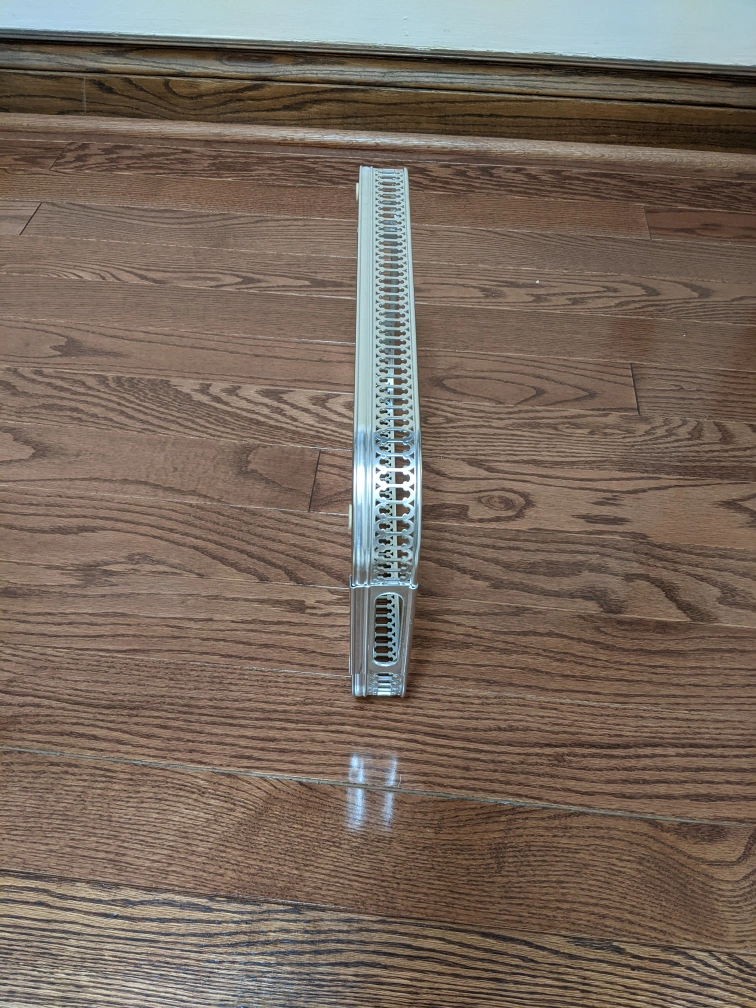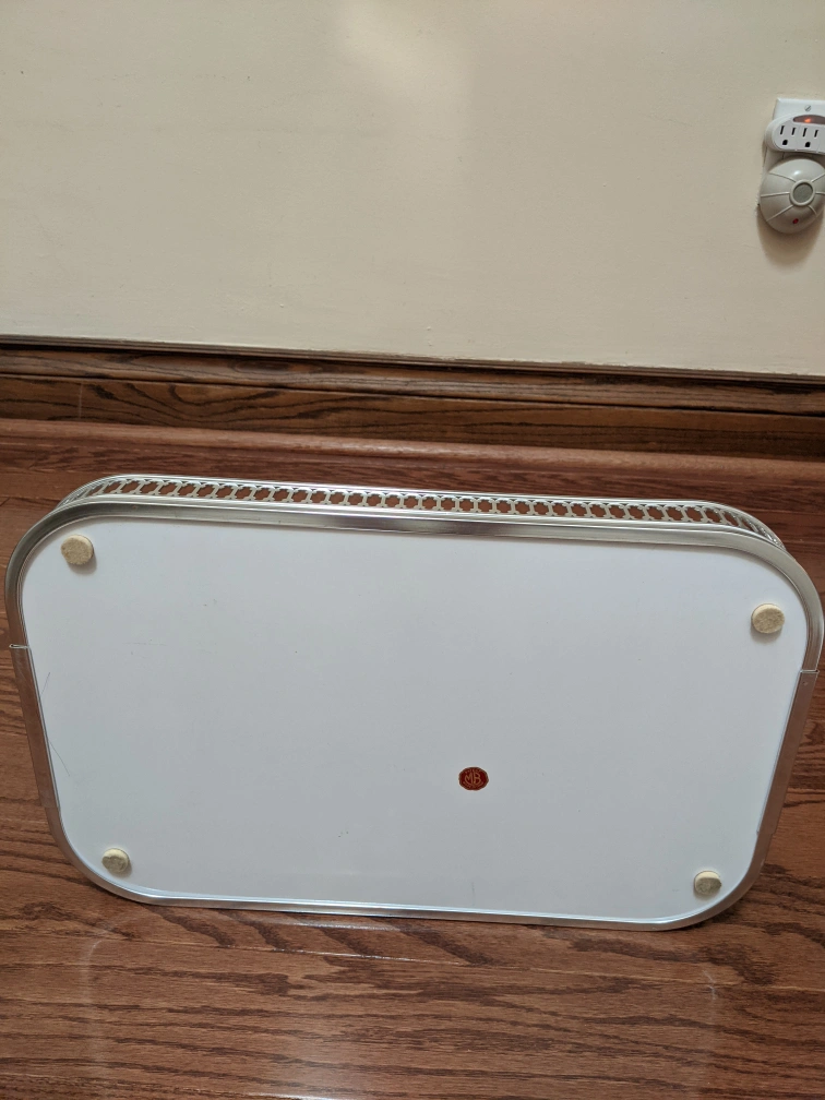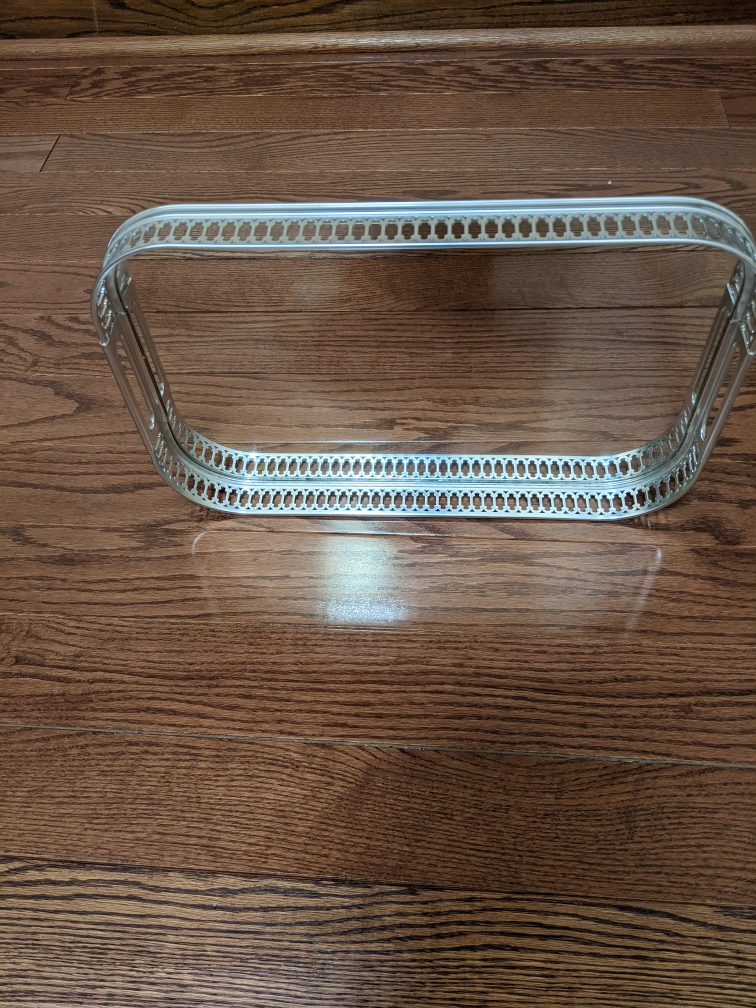 Rectangular mirrored tray. Silver metal frame. Intricate detailing around the edge. Features a handle.