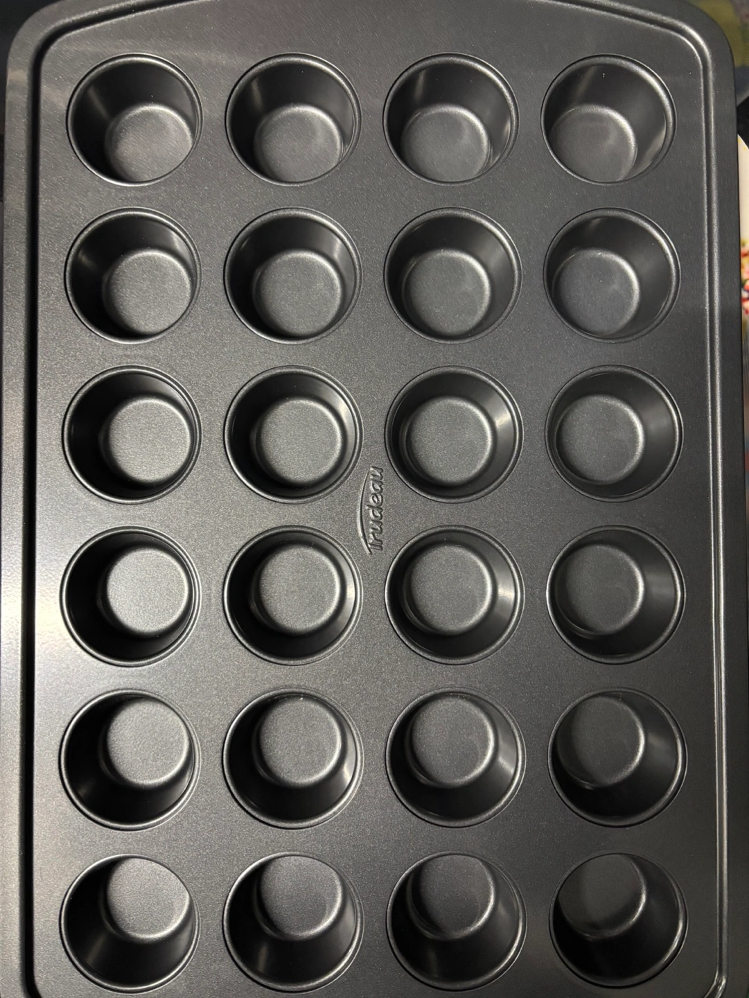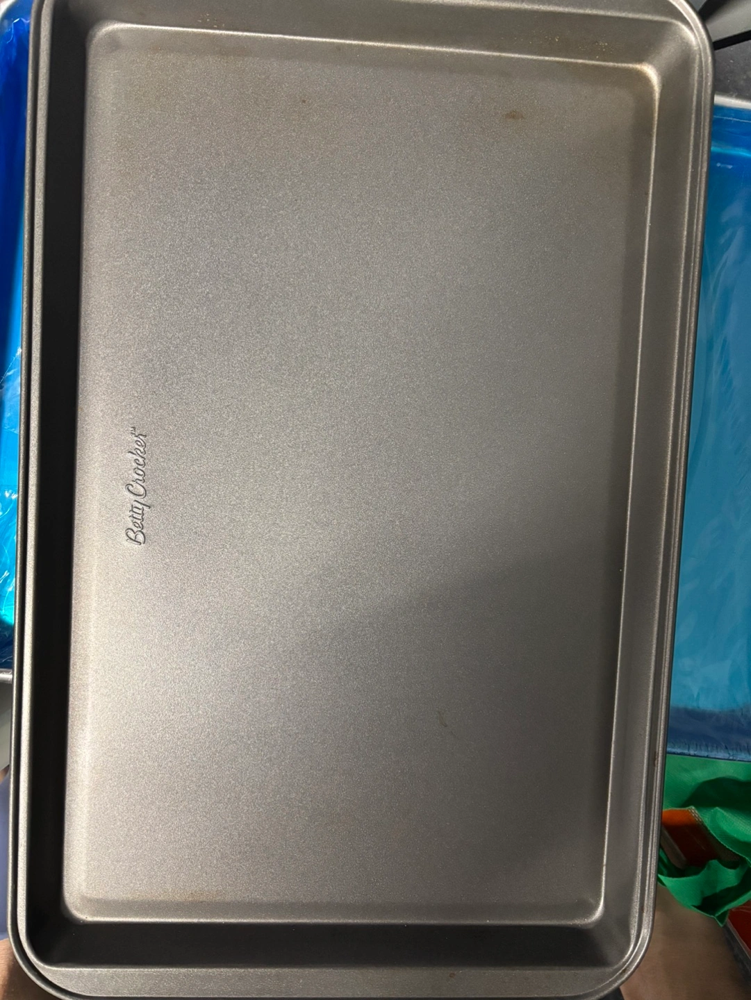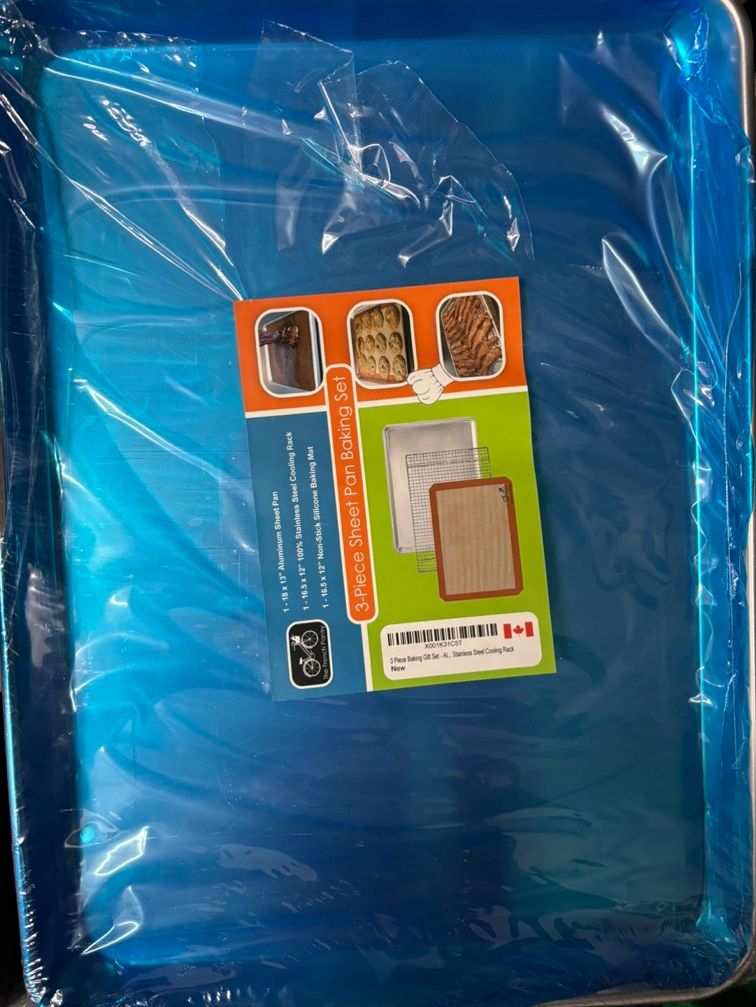 Four baking pans included. Wilton 12-cavity brownie pan, Baker's Choice baking sheet, and a three-piece baking set with a baking sheet, cooling rack, and silicone baking mat. Great for all your baking needs. That first picture is already $20 plus tax at bulk and barn