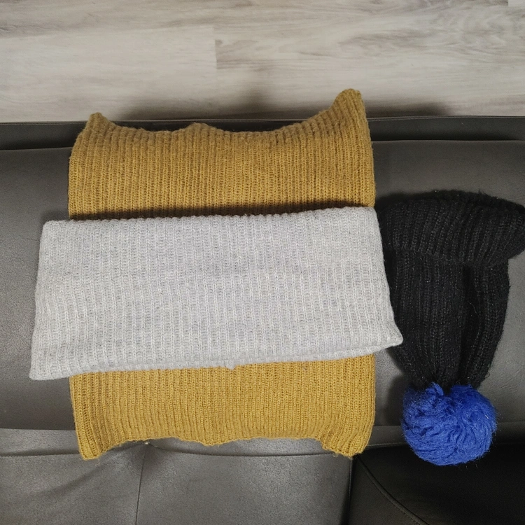 Mustard yellow and grey tube scarves. Black beanie with a blue pom-pom. Soft and cozy winter wear.