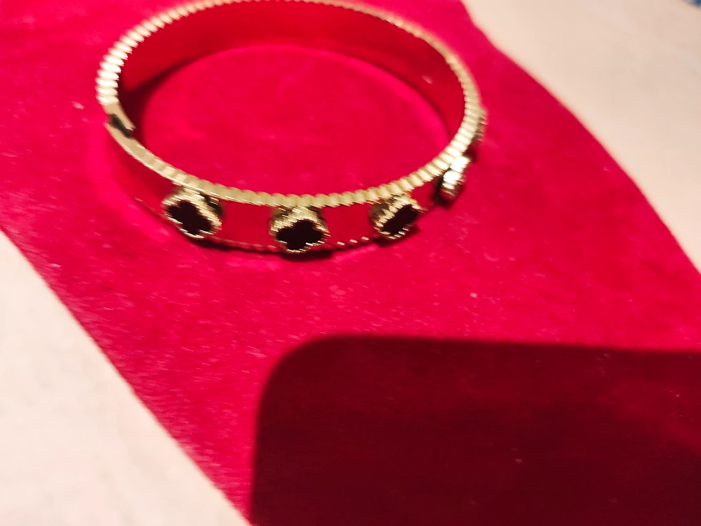 Elegant gold bracelet. Features black clover-shaped accents. Looks like a rigid bangle style. Perfect for adding a touch of sophistication to any outfit.