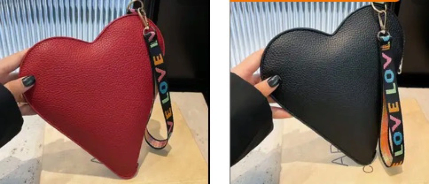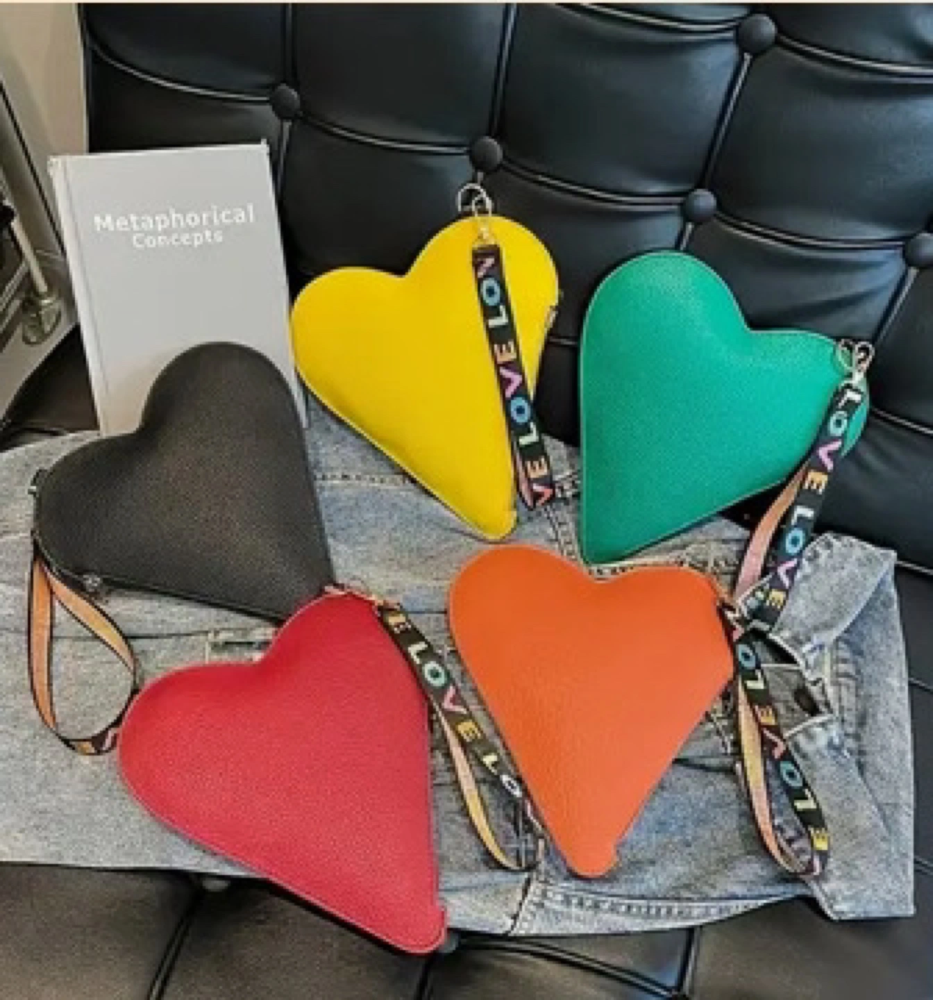 Cute heart-shaped bag / purse . Features a zipper closure and colourful LOVE strap. Perfect for everyday use or special occasions. Black or red.