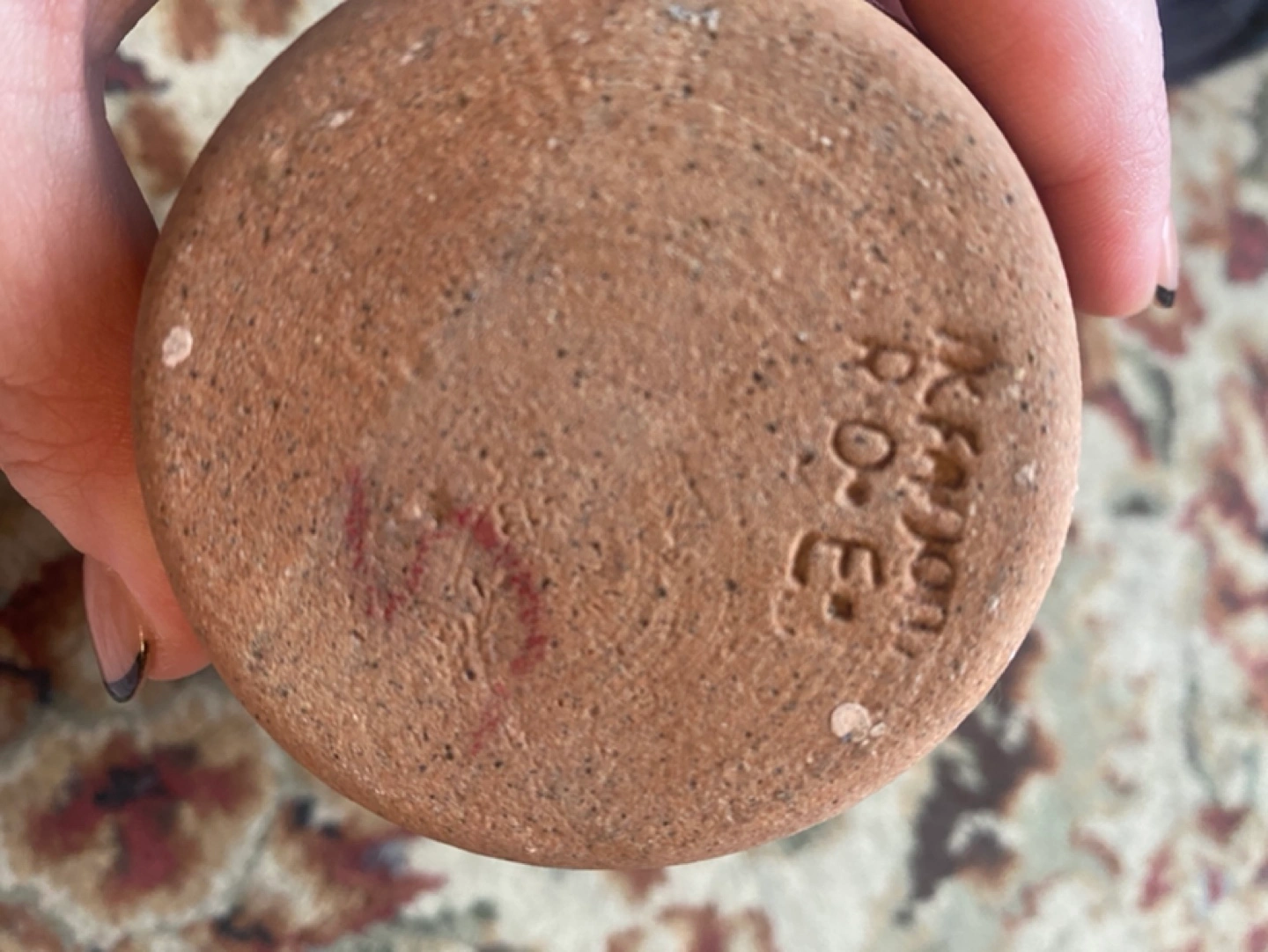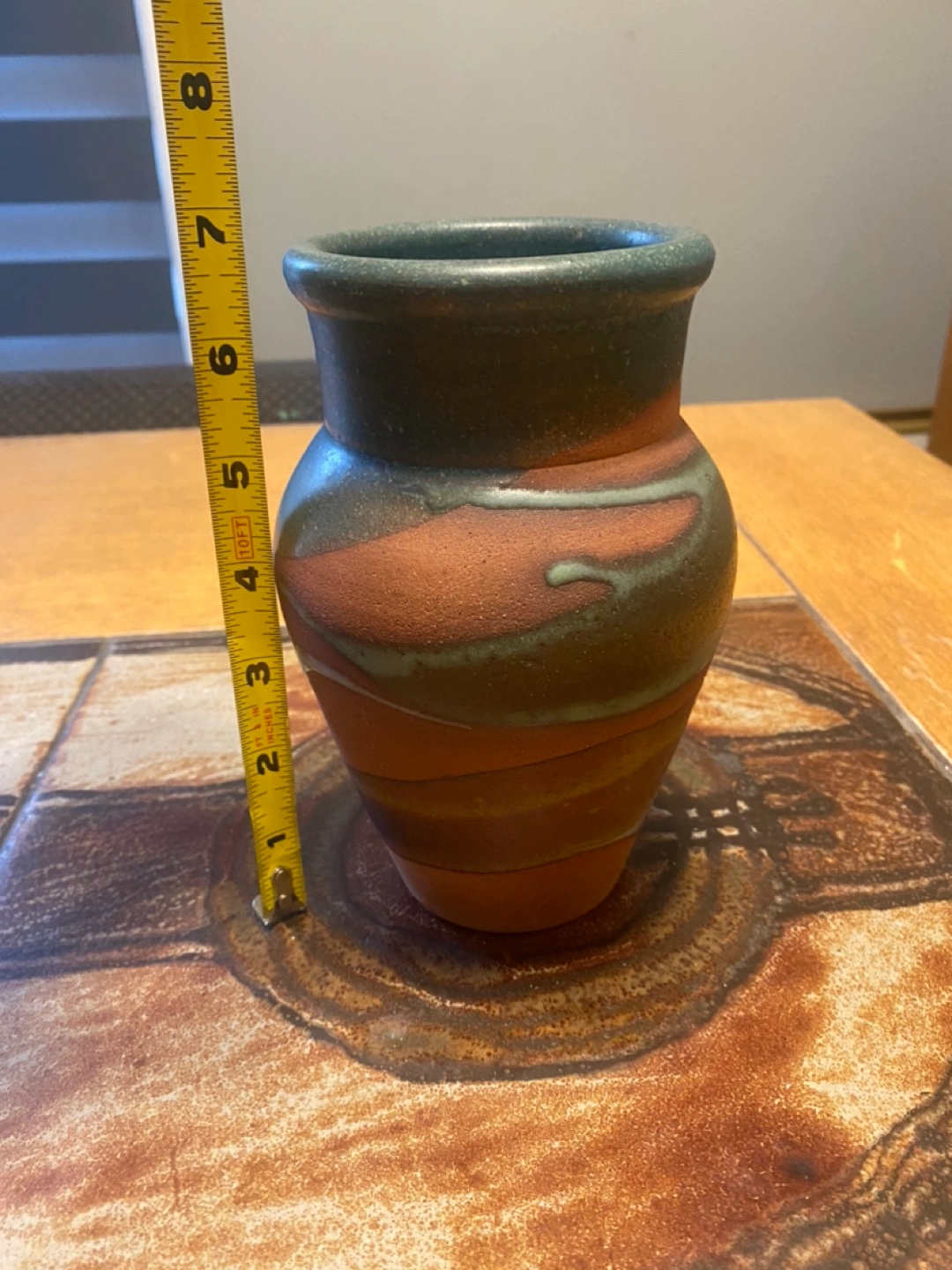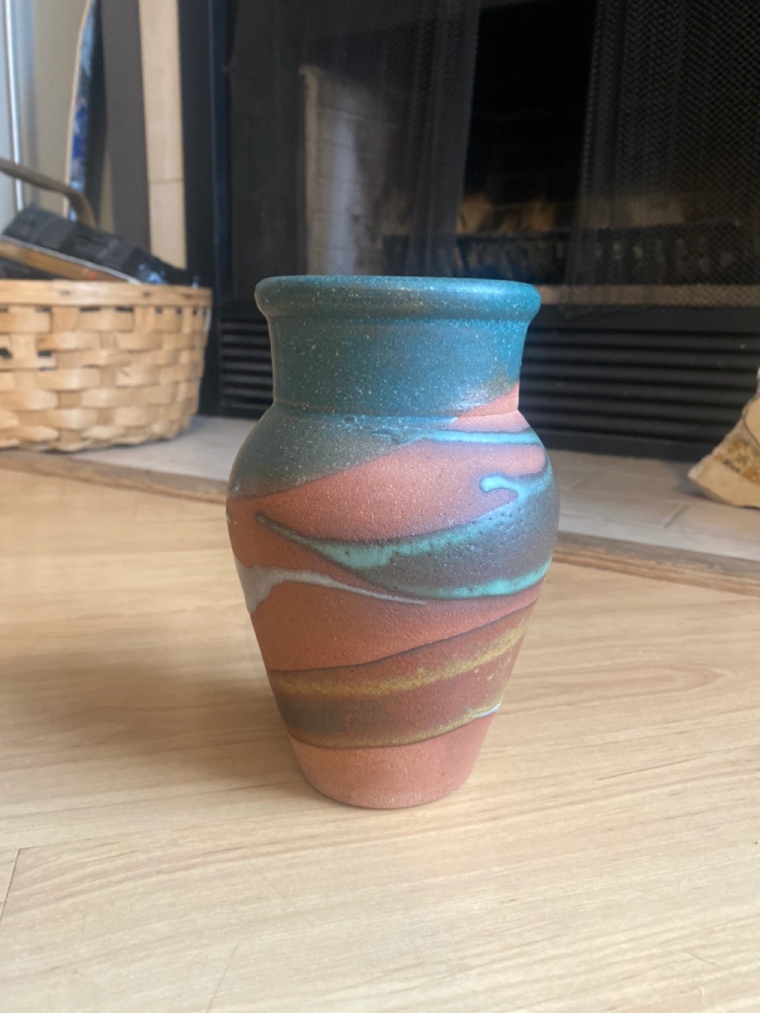 Small, hand-thrown pottery vase. Features a unique southwestern-inspired design with terracotta, teal, and cream colours. Excellent condition. Measures approximately 7 inches tall.