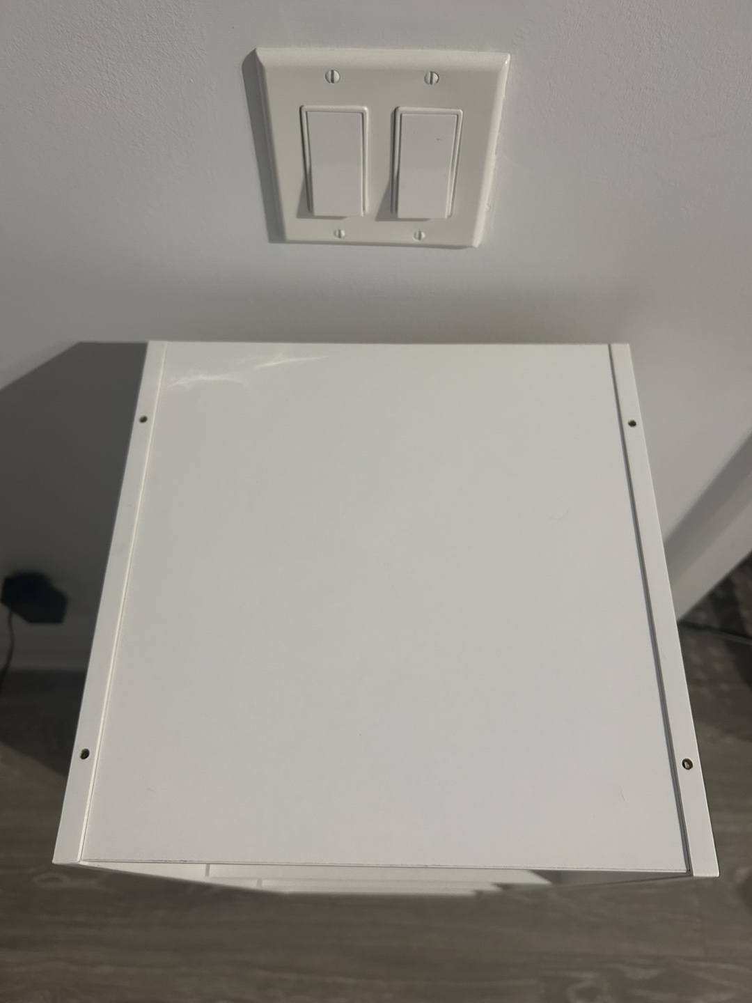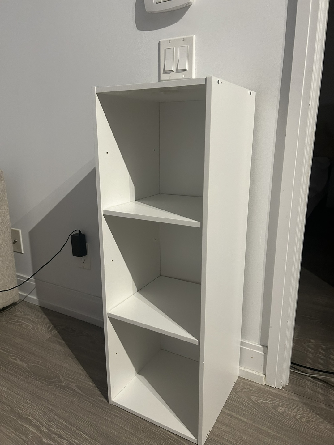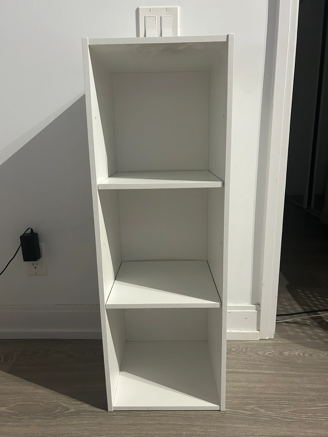 Small white bookcase. Three shelves. Assembled. Good condition. Perfect for small spaces.