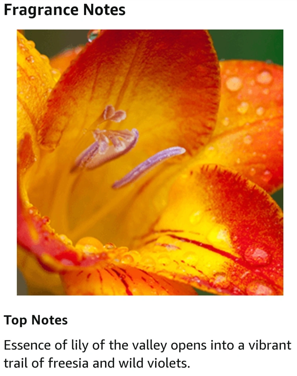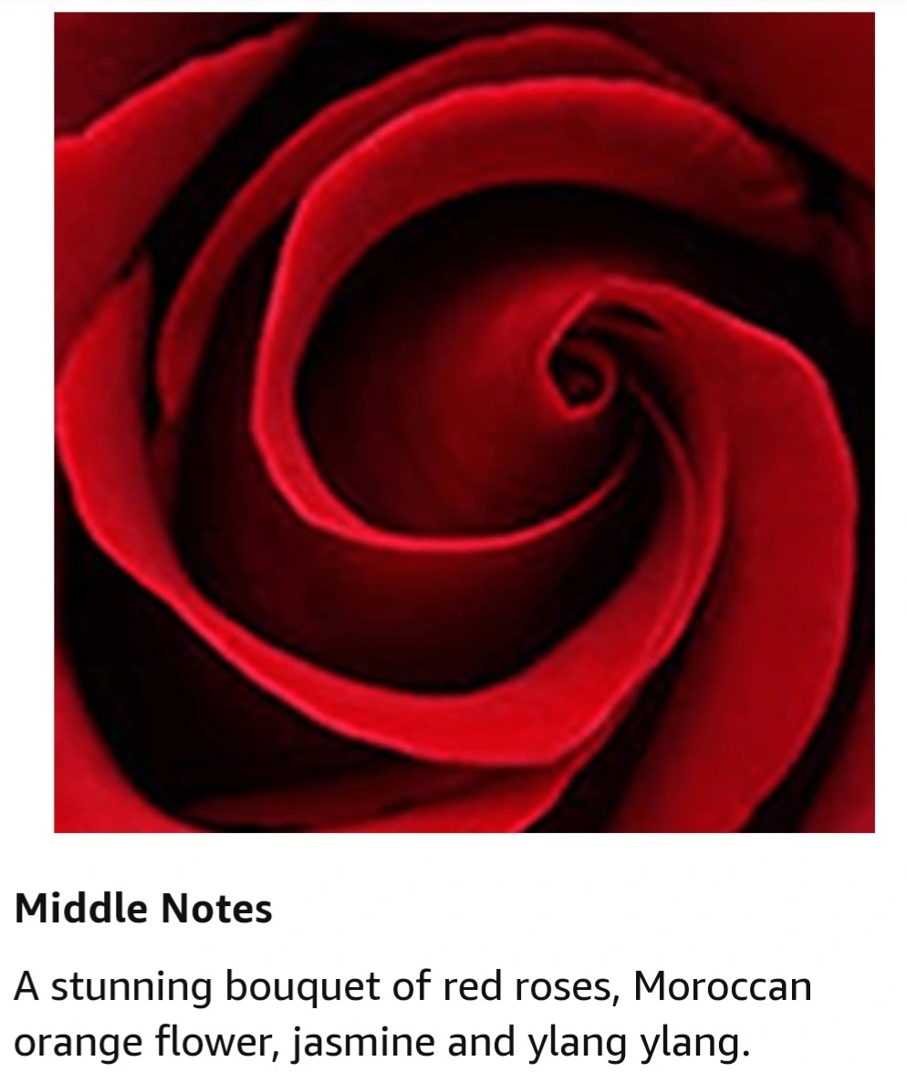 Floral scent with notes of red roses, Moroccan orange flower, jasmine, ylang ylang, lily of the valley, freesia, wild violets, oakmoss, honey and sandalwood.