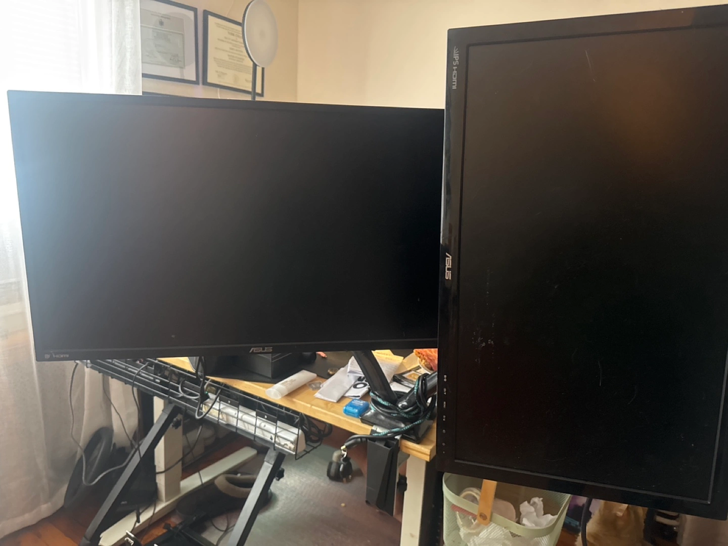 Two ASUS monitors mounted on a sturdy dual monitor desk mount. Great for maximizing workspace. Includes all cables and mounts. Perfect for home office or gaming setup.