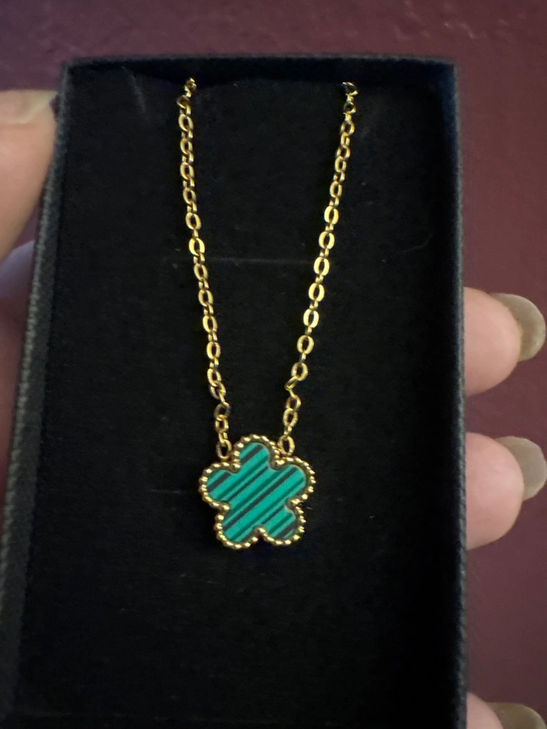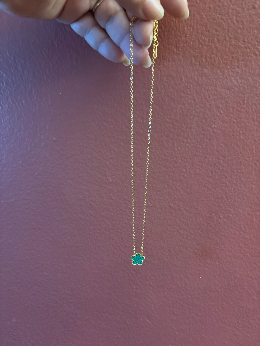Dainty 18 K SS gold necklace features a small flower pendant. Green stone inlay. Gold chain. Perfect everyday accessory. Comes with Box and Cleaning Cloth