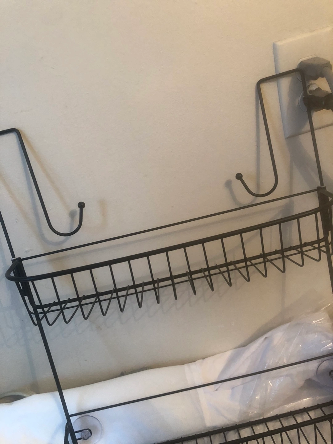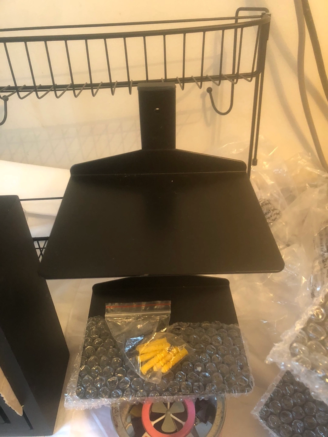 Three black square wall shelves. Set of three, various sizes. One black metal shower caddy. Brand new.