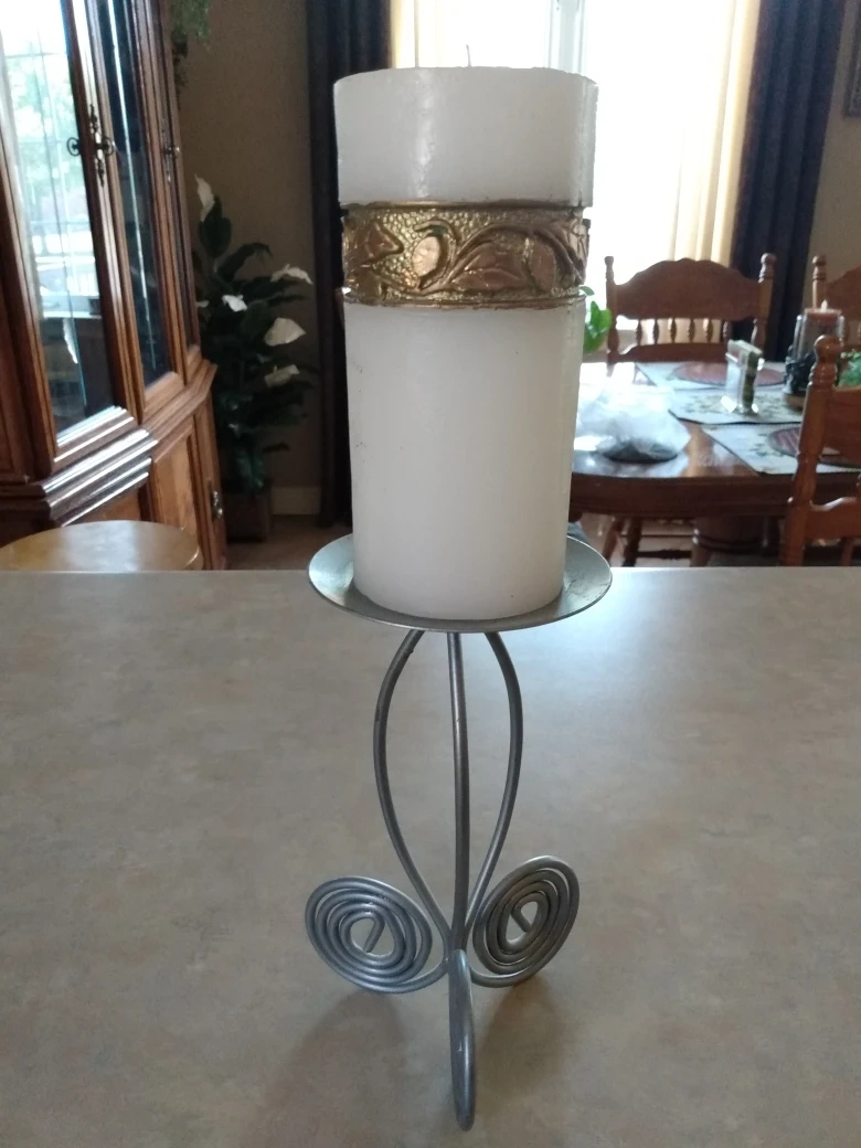 Large pillar candle with a metallic holder. Purple and brown marbled colour. Metal holder has a decorative swirling design. Perfect for home décor.