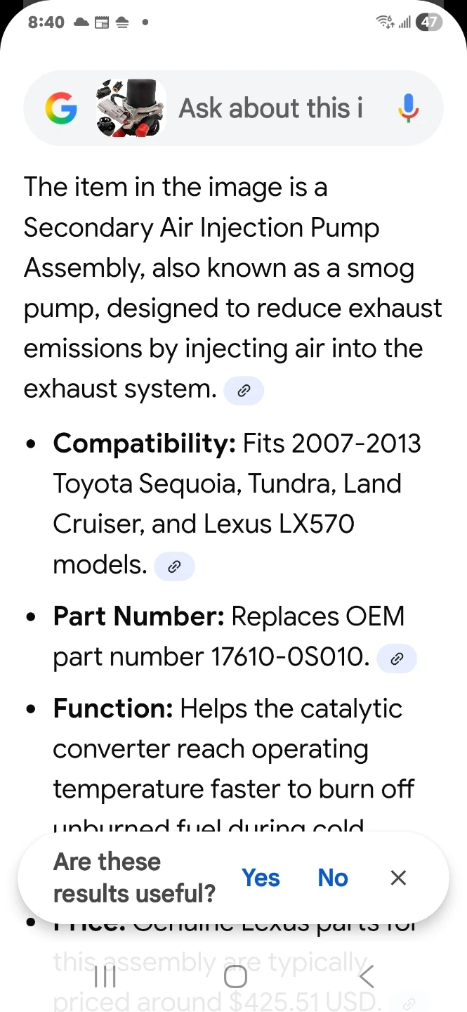 This is a Secondary Air Injection Pump Assembly, also known as a smog pump. It's designed to reduce exhaust emissions by injecting air into the exhaust system. Compatibility includes 2007-2013 Toyota Sequoia, Tundra, Land Cruiser, and Lexus LX570 models.