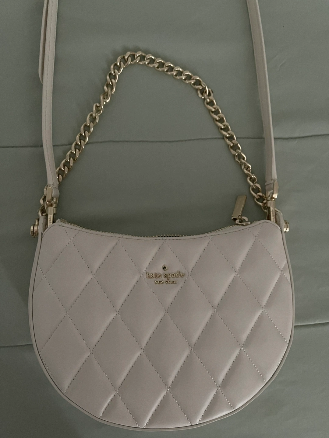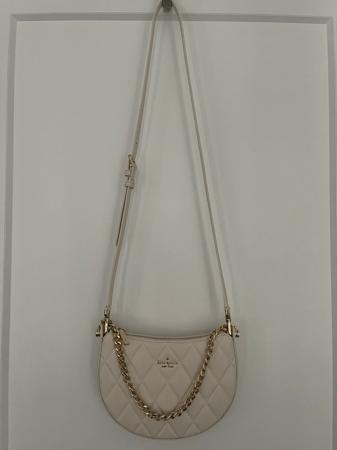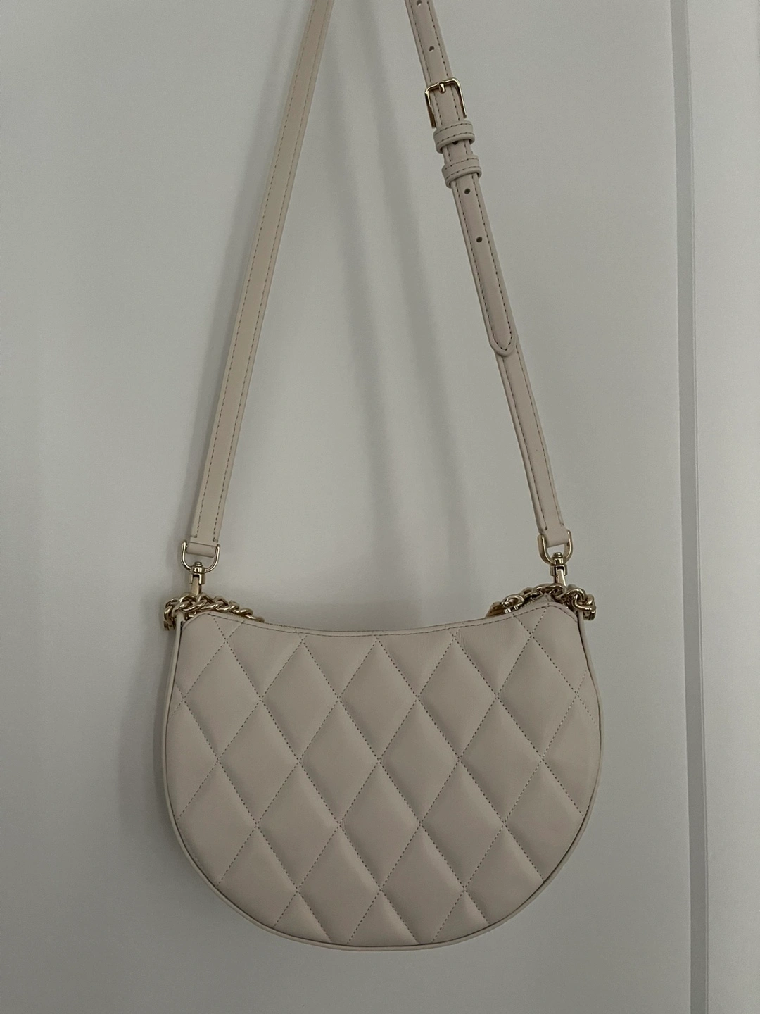 Cream coloured quilted leather crossbody bag. Features a half-moon shape, gold chain strap and zipper closure. Interior has multiple card slots. Excellent pre-owned condition.