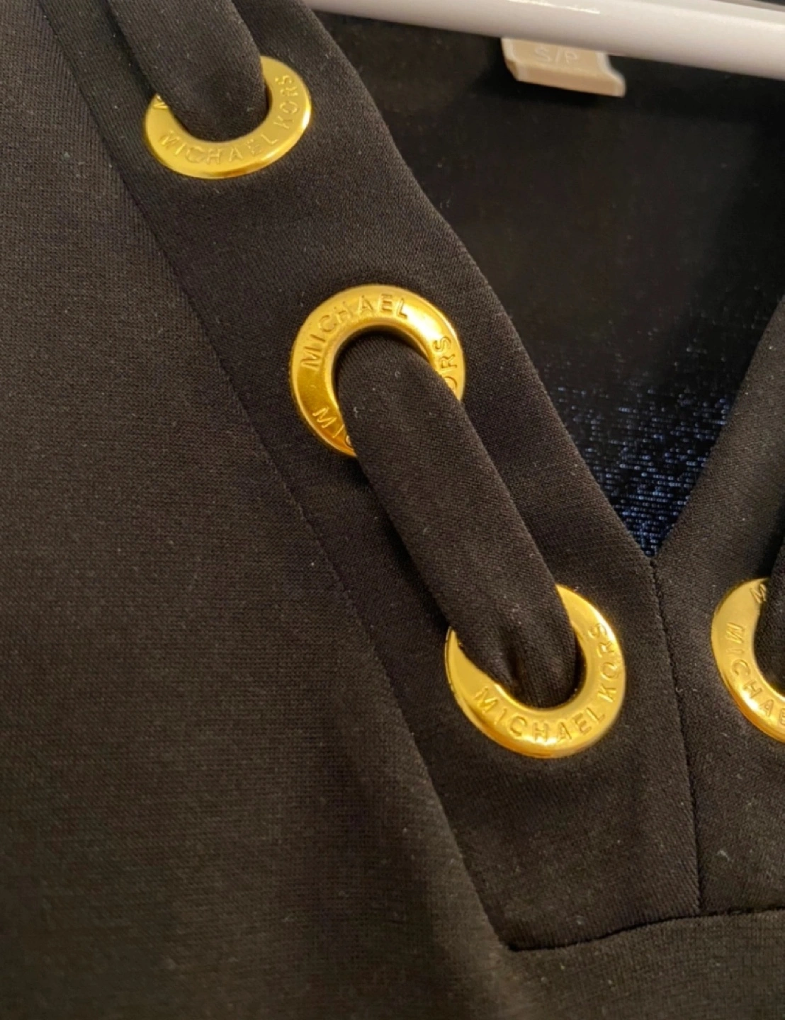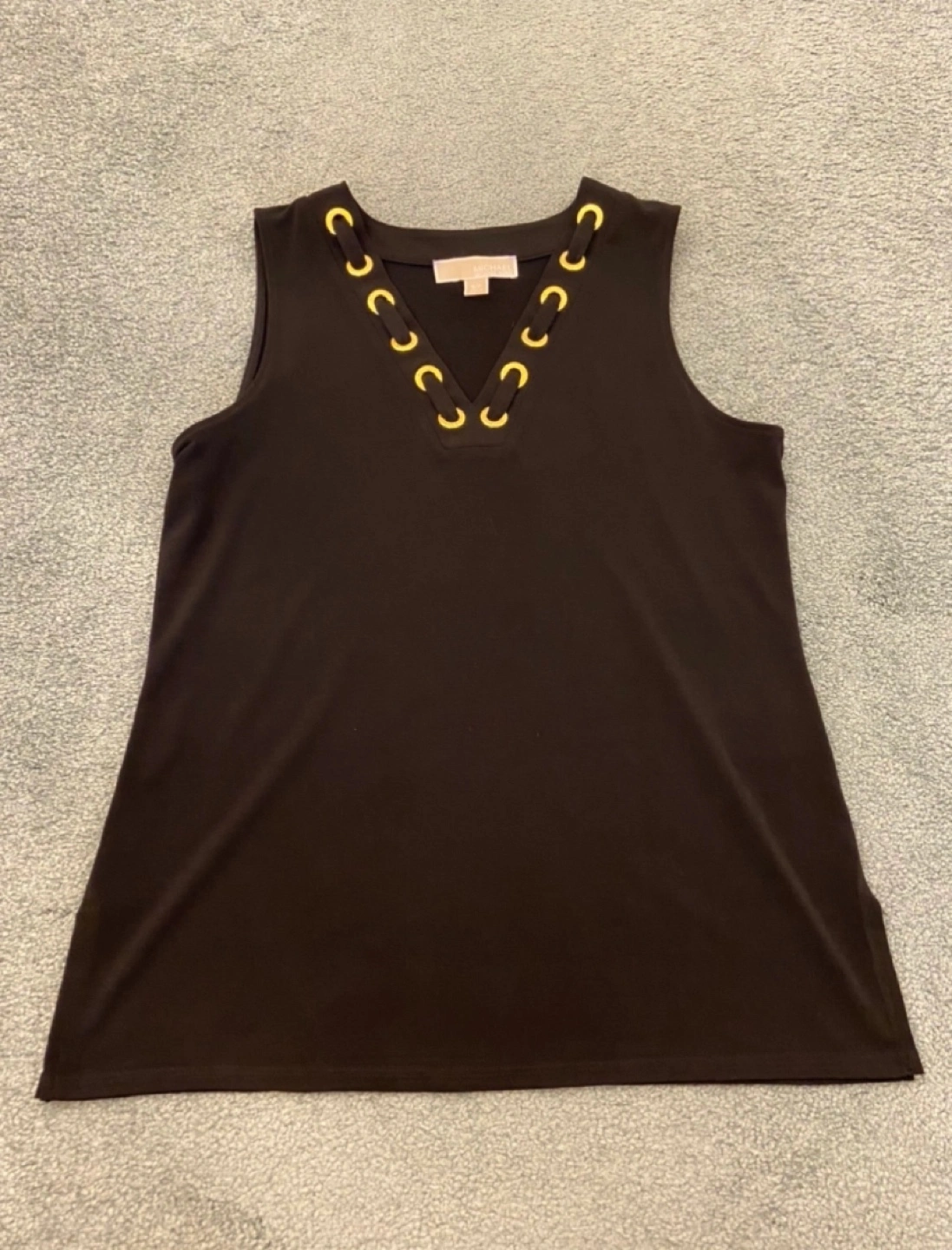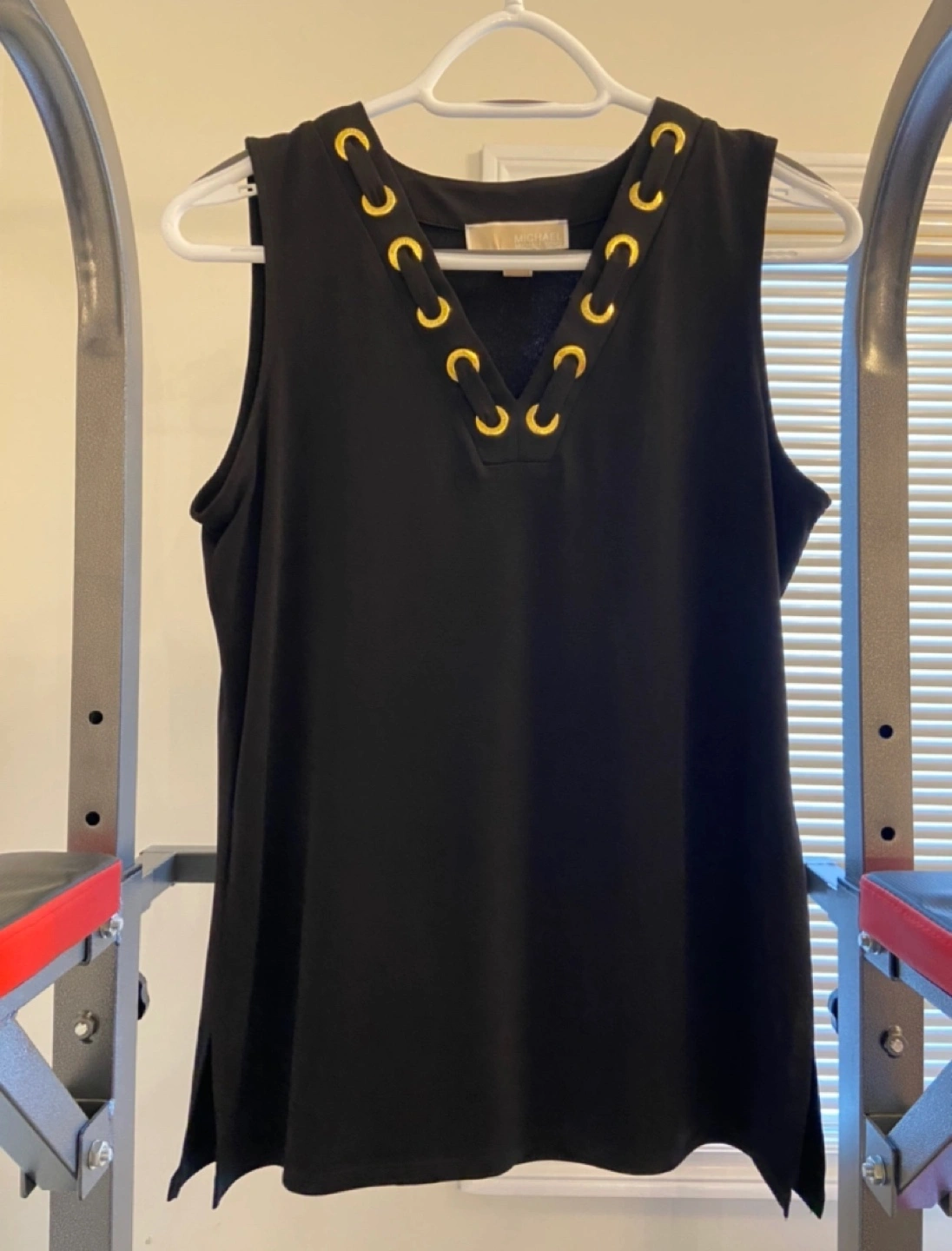 830Black sleeveless top. Size small. V-neck with gold grommets. Made in Vietnam. 95% polyester, 5% elastane. Side slits. Worn only a few times, like new Meet by the Hwy 7 and Valleymede McDonalds or Toronto Union Station (certain weekdays only)