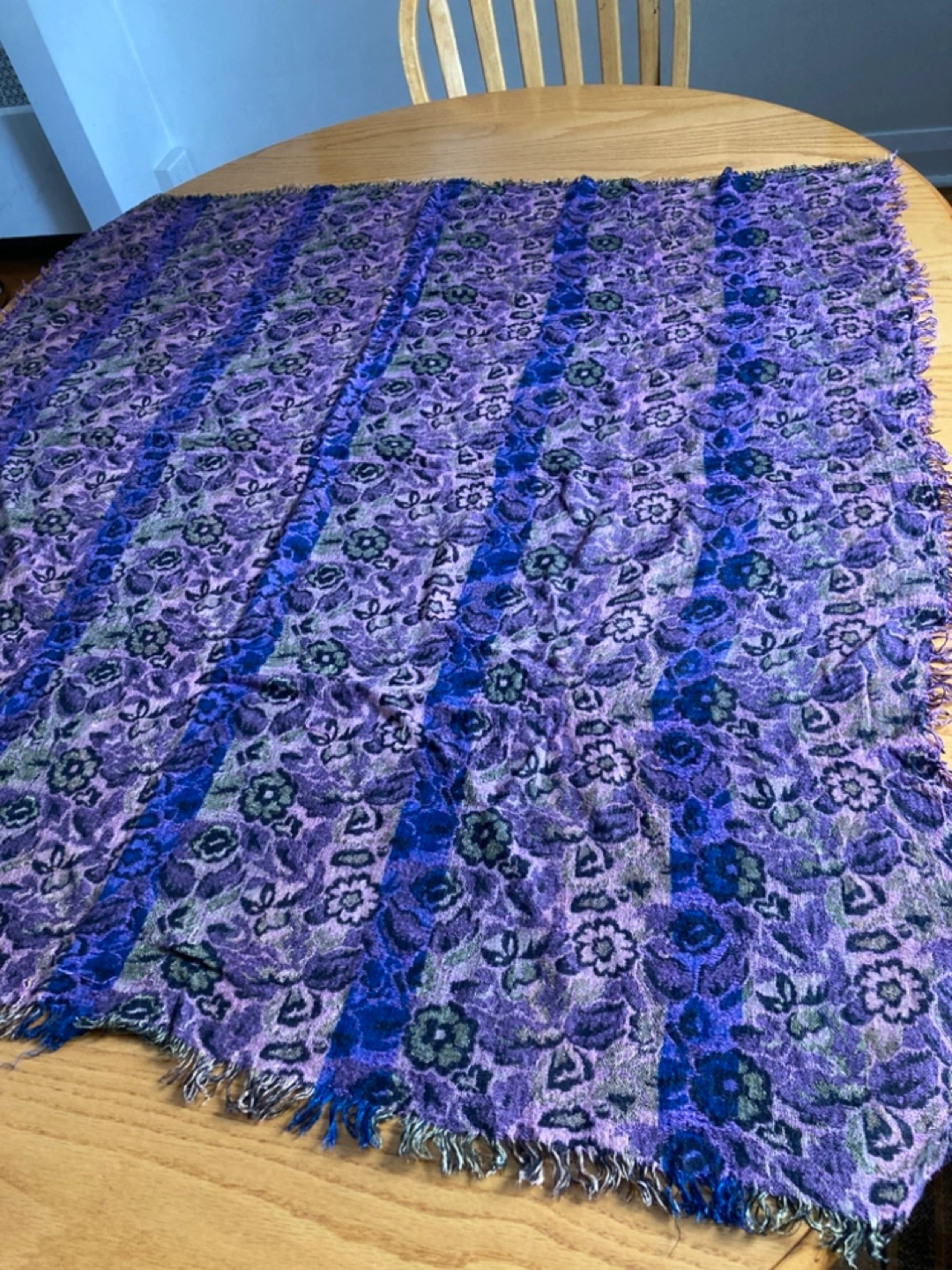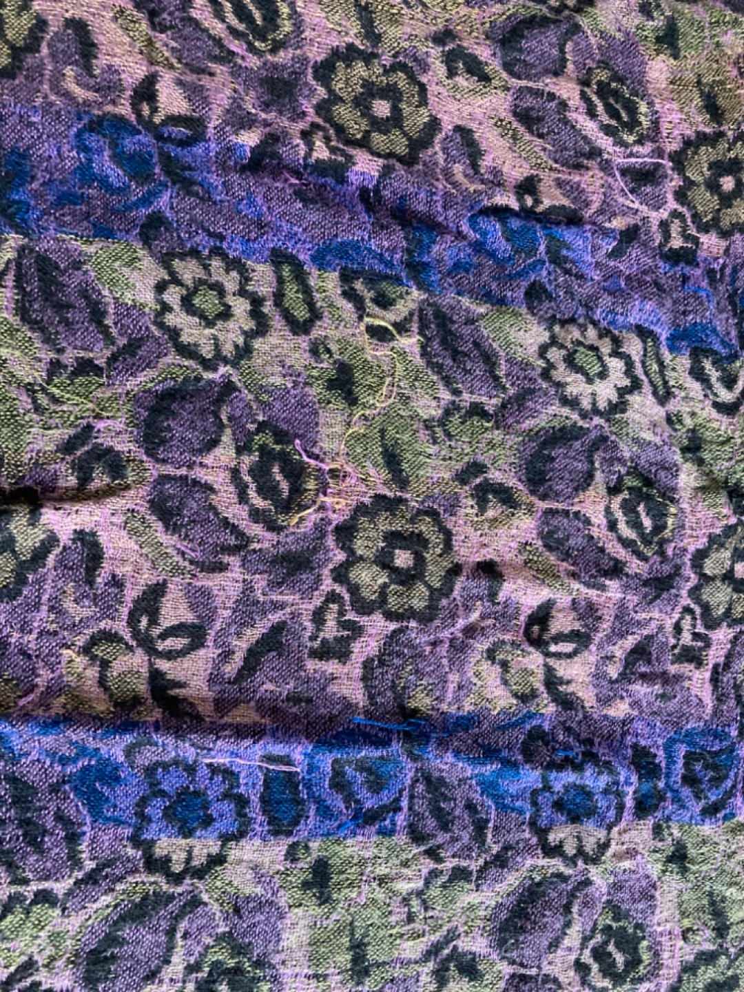 Soft woven rayon featuring various shades of purple, blue, loden green, and brown. Fringed edges. Soft material.