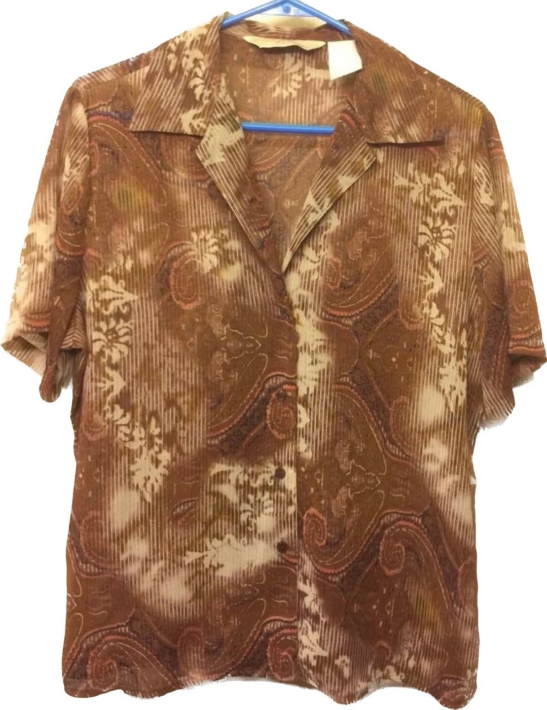 Short sleeve button-up blouse. Brown and beige paisley print. 100% polyester. Size large.