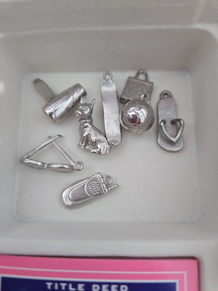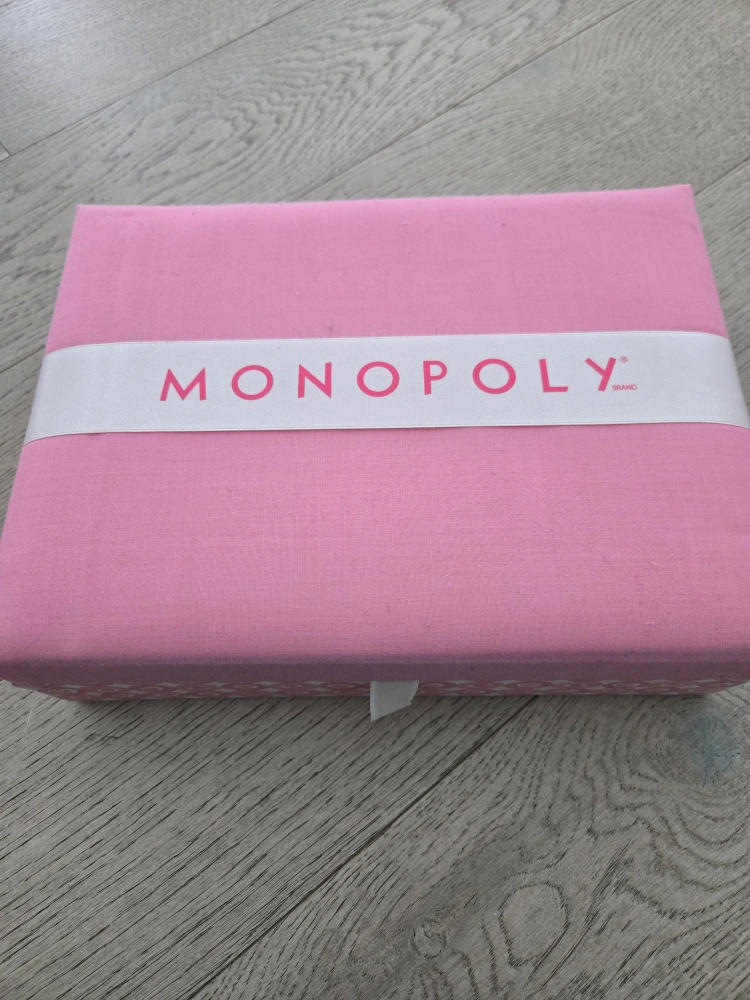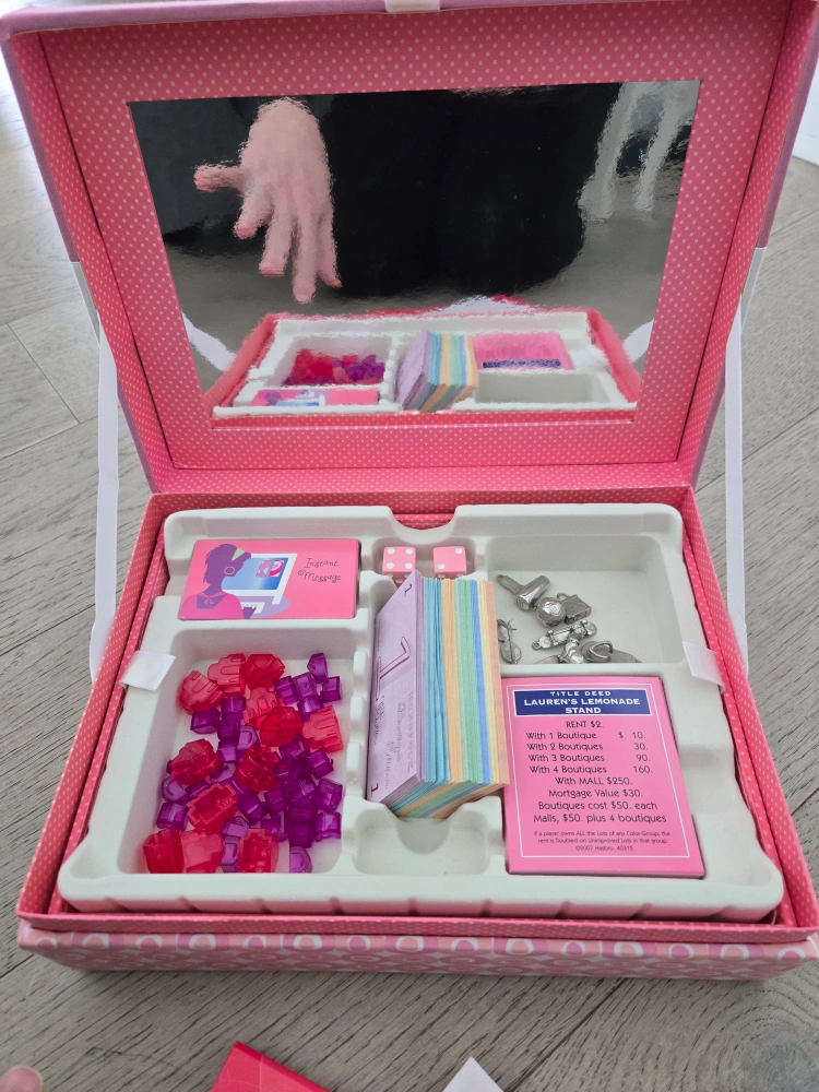 Pink Boutique Edition Monopoly game. Includes metal board, pieces, money, and charm pieces. Complete and in excellent condition. Compact jewelry storage box.