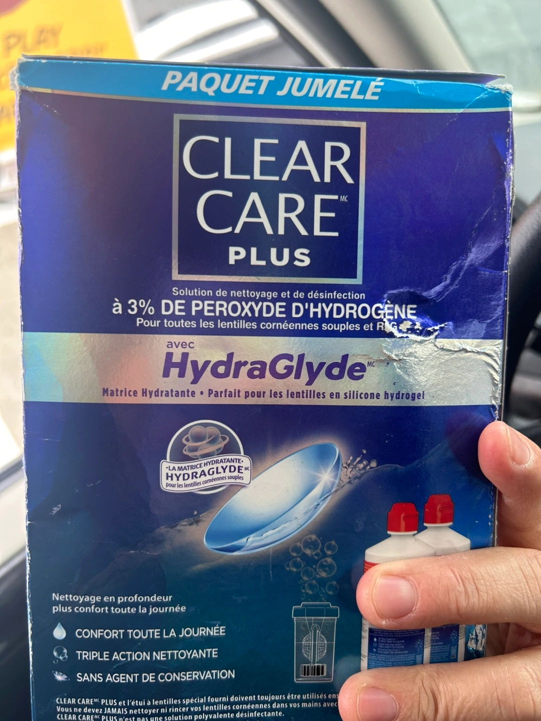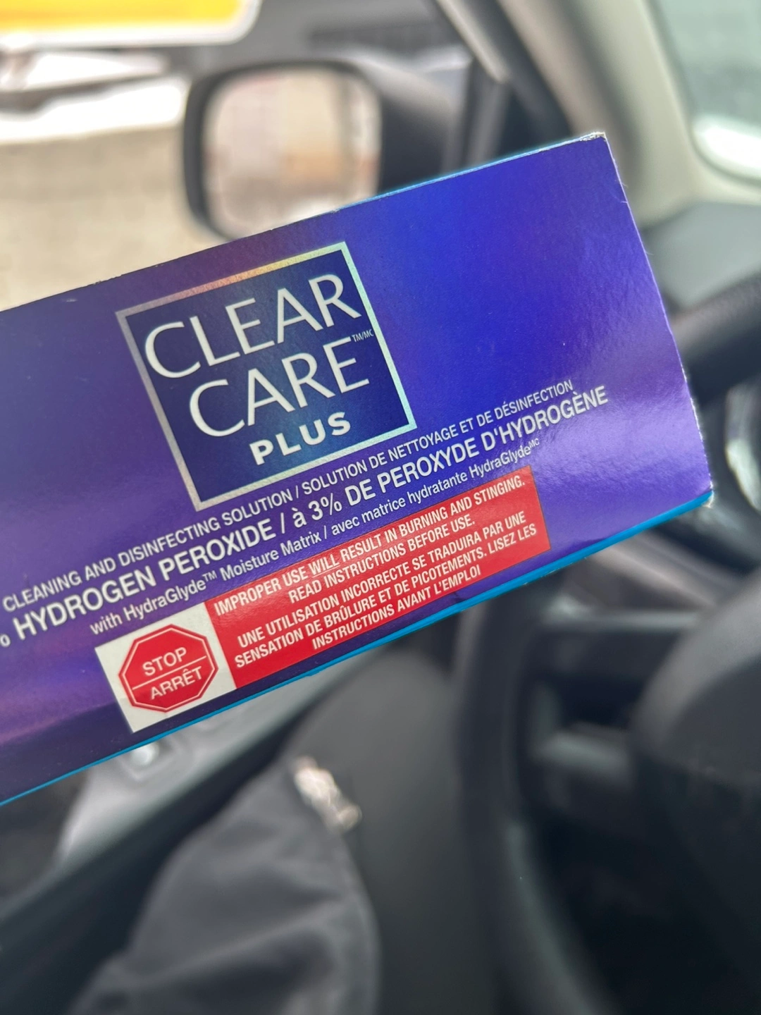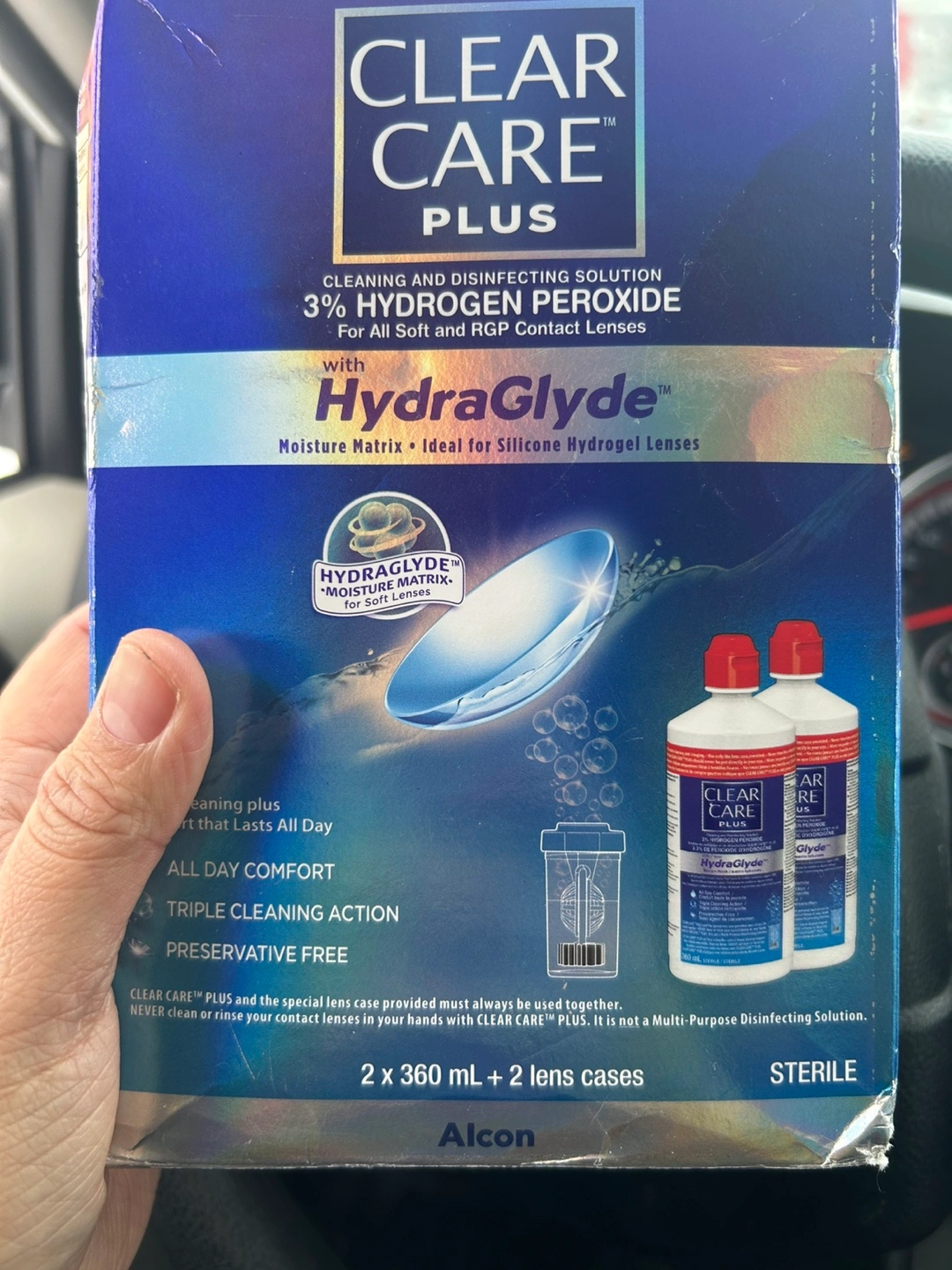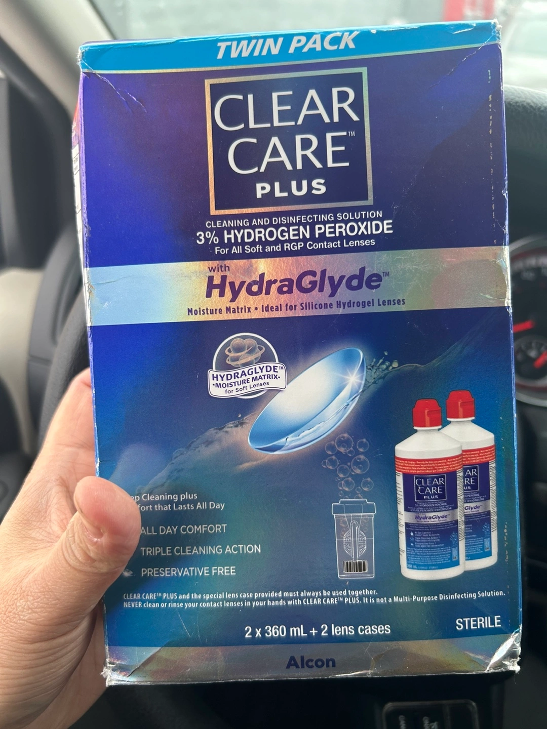 76Twin pack of Clear Care Plus contact lens solution. 3% Hydrogen Peroxide. With HydraGlyde Moisture Matrix. Ideal for silicone hydrogel lenses. Includes two lens cases. Sterile. Yonge and Steeles