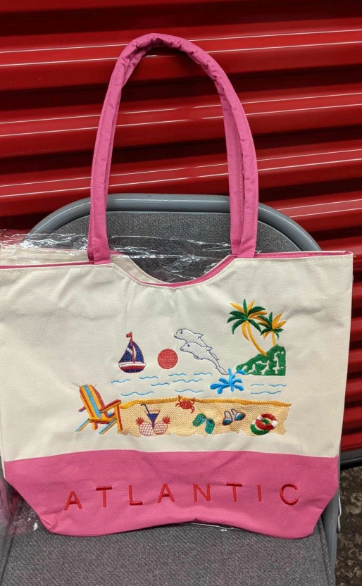 New large tote bag with embroidered beach scene. Pink padded straps and bottom.
