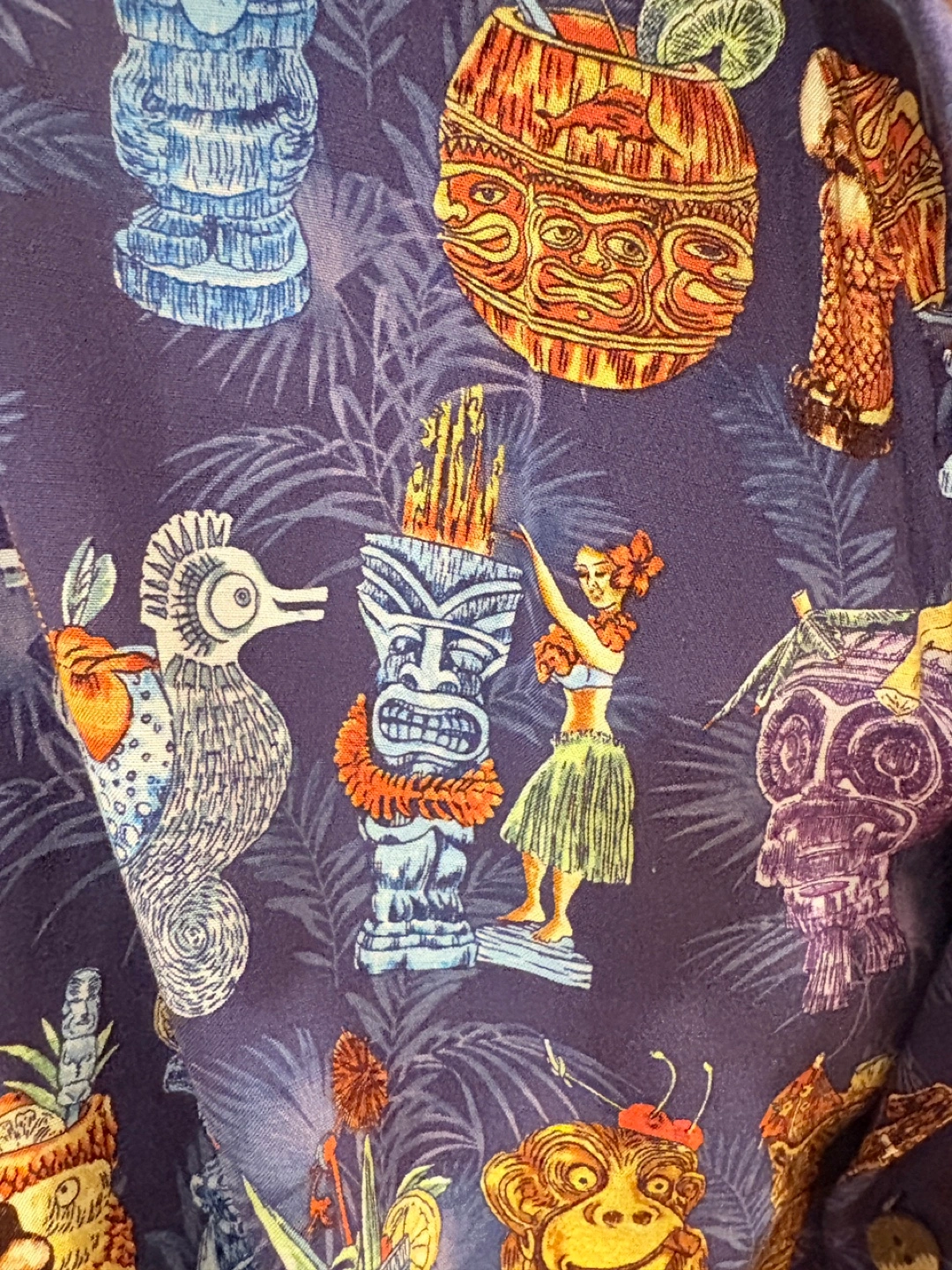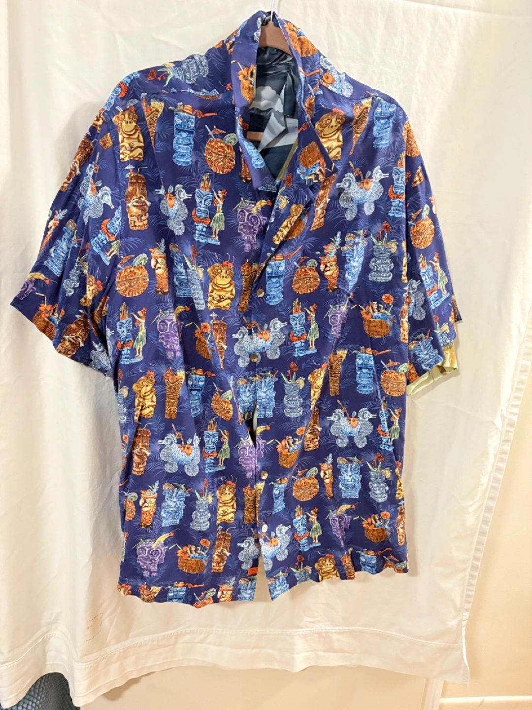 Men's Tommy Bahama Hawaiian shirt. Size 3XL. Features a vibrant tiki print. Made in China.
