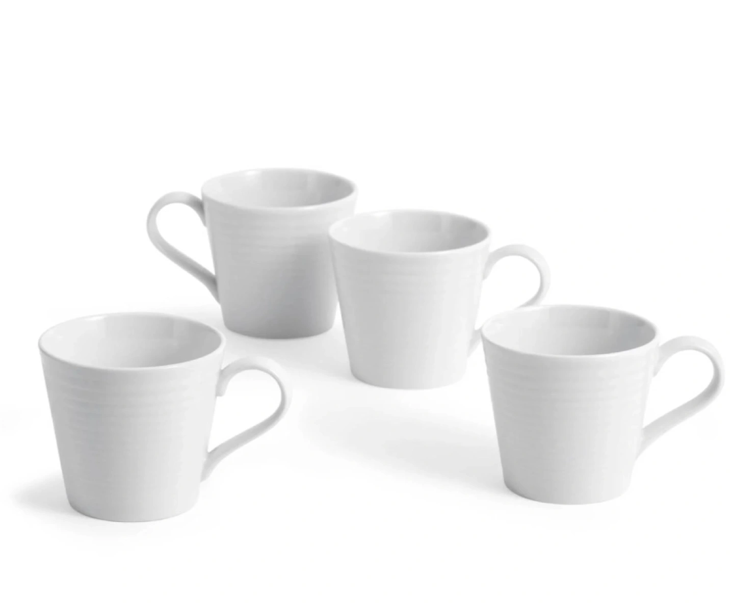 Set of four stoneware mugs, featuring the trademark Maze circular design and an all over white glaze. Microwave and dishwasher safe. Excellent condition.