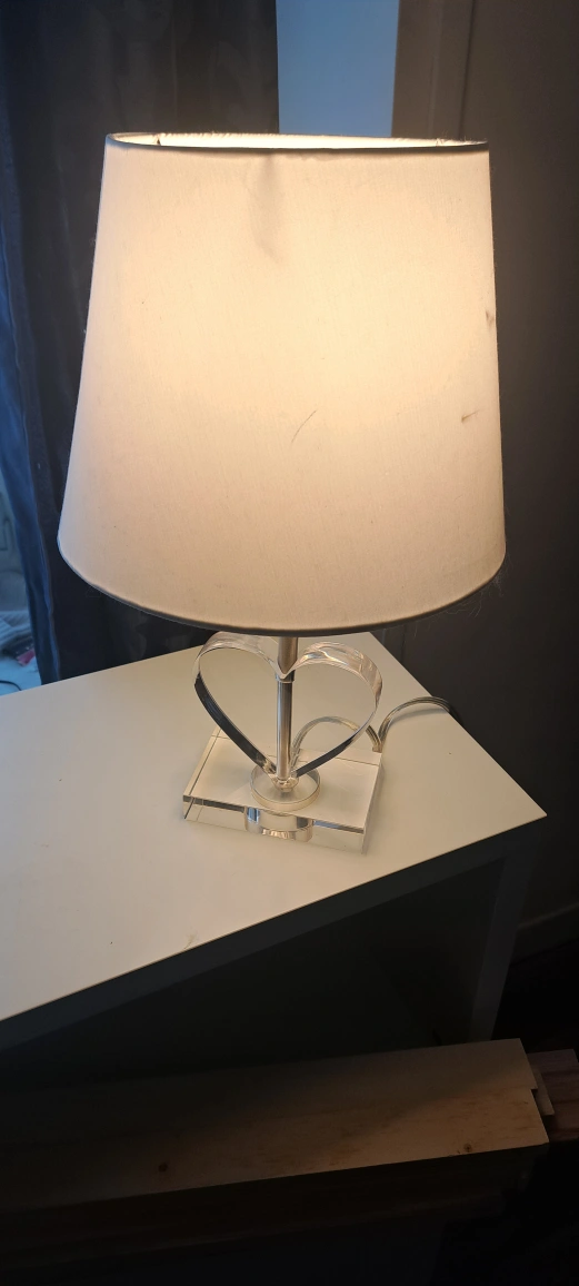Cute table lamp, heart shaped base. Acrylic base and off-white shade. Good condition, a few scuffs on the lamp shade. Comes with lightbulb.