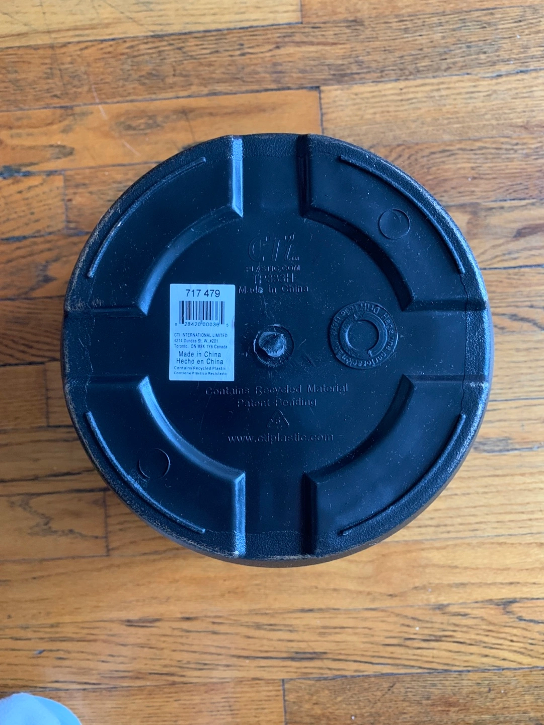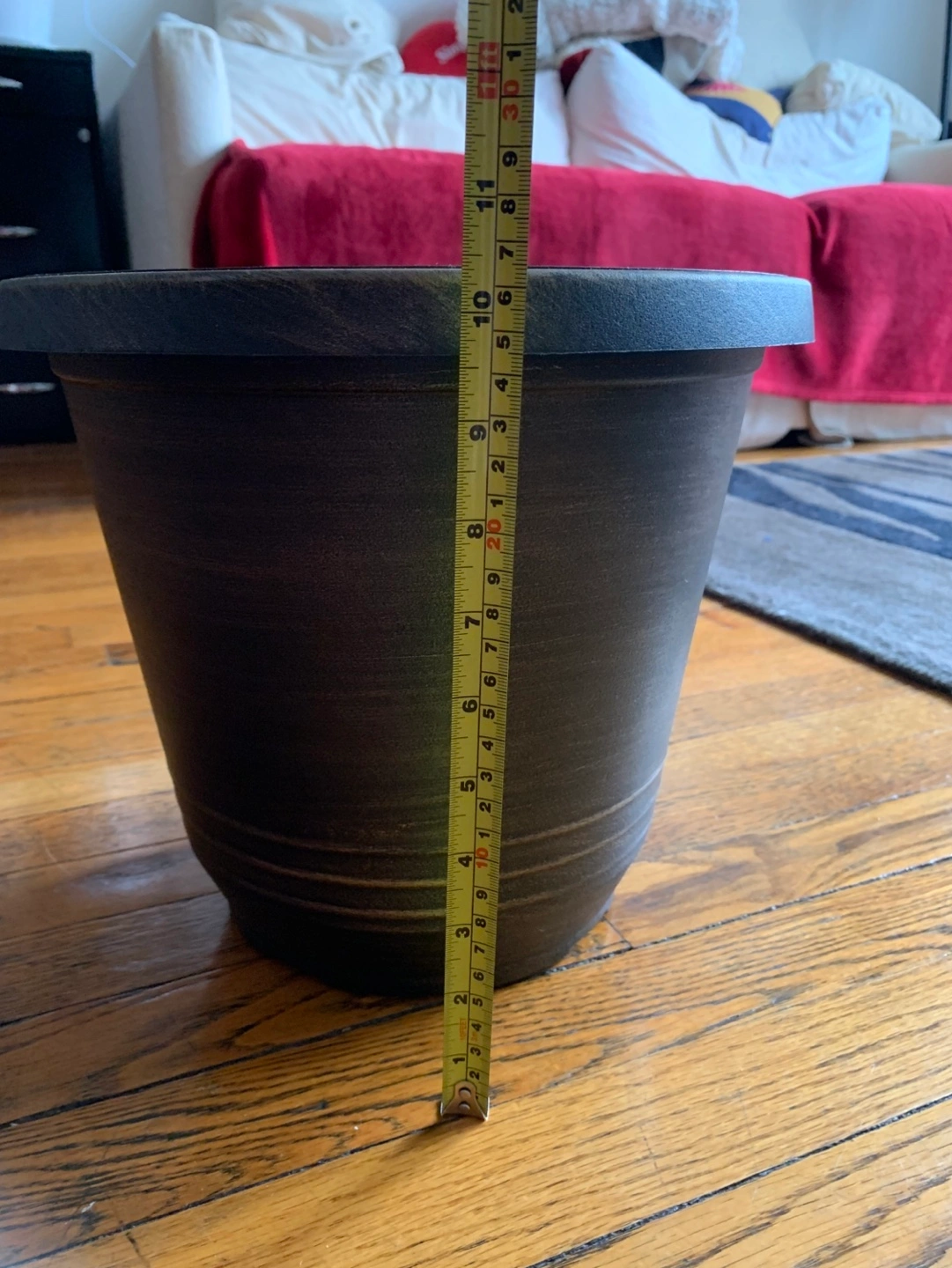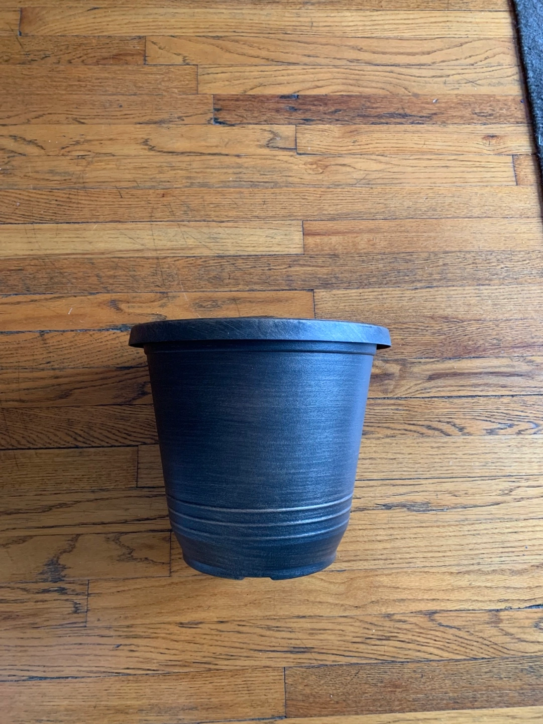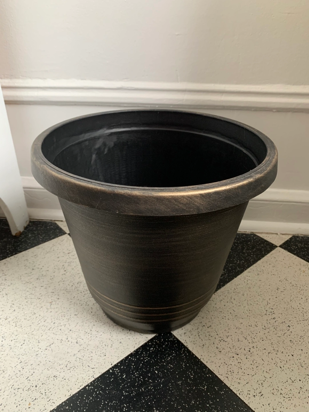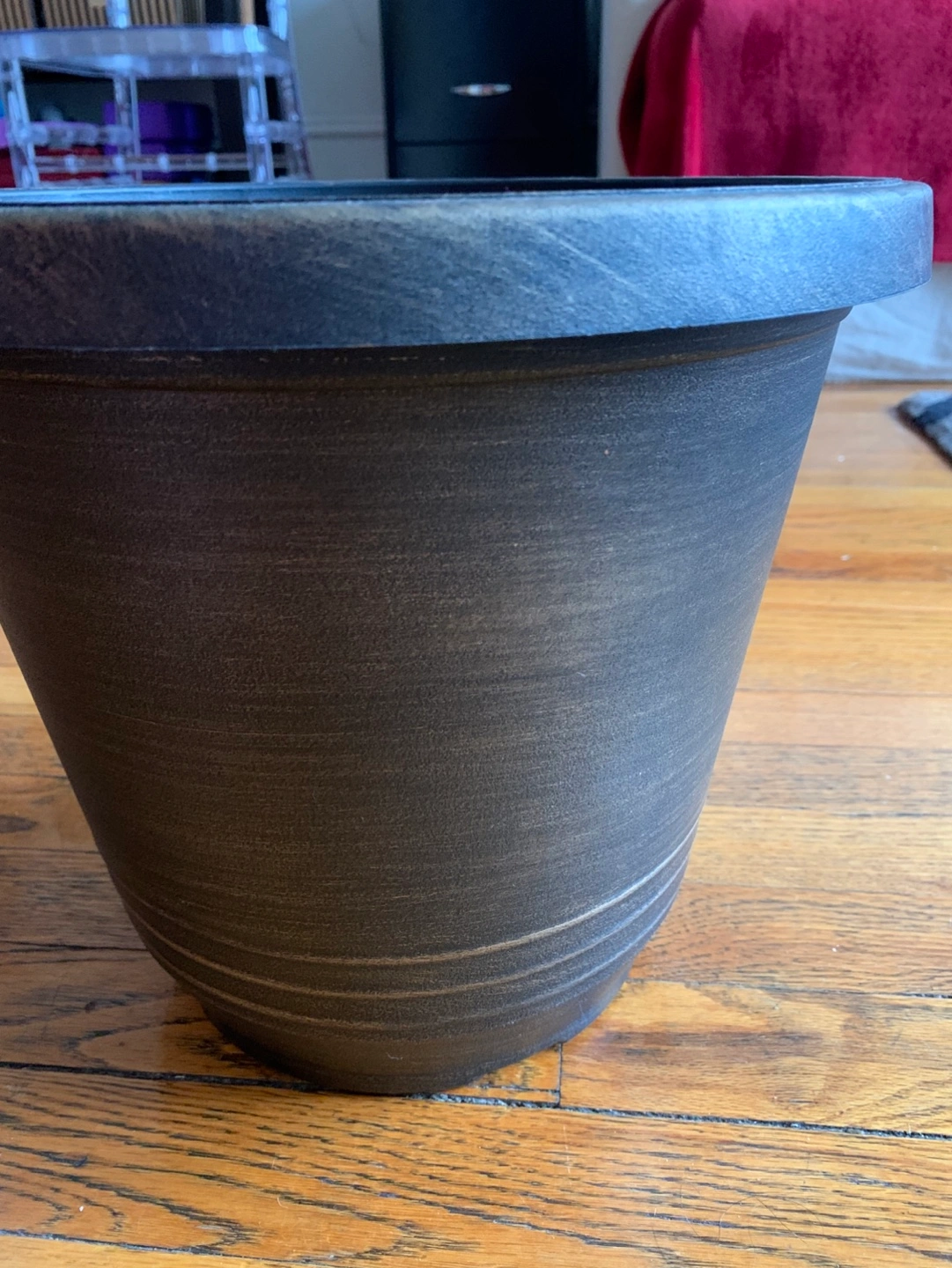 Dark brown with goldish accents plastic planter pot. Measures approximately 12 inches in diameter and 10 ,5 inches tall. Excellent condition. No hole in the bottom.