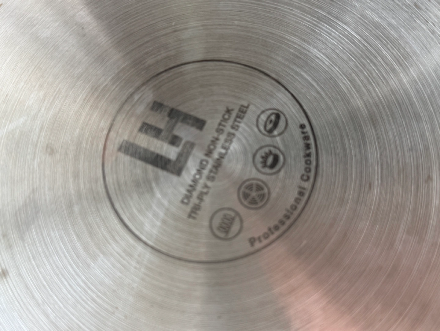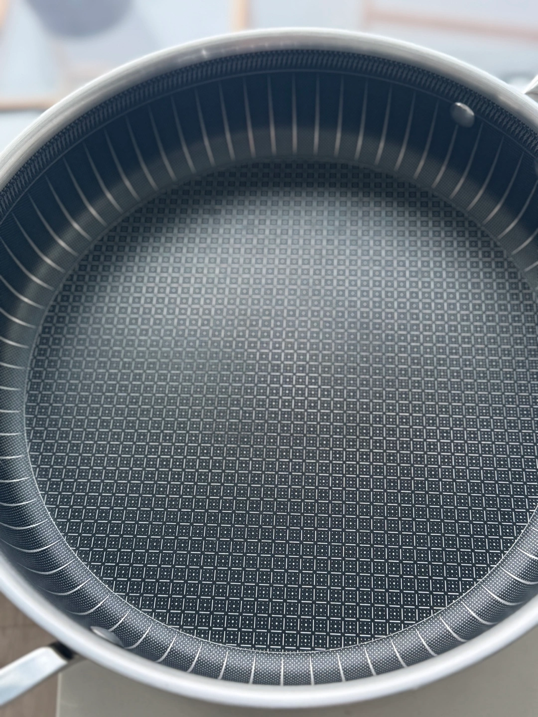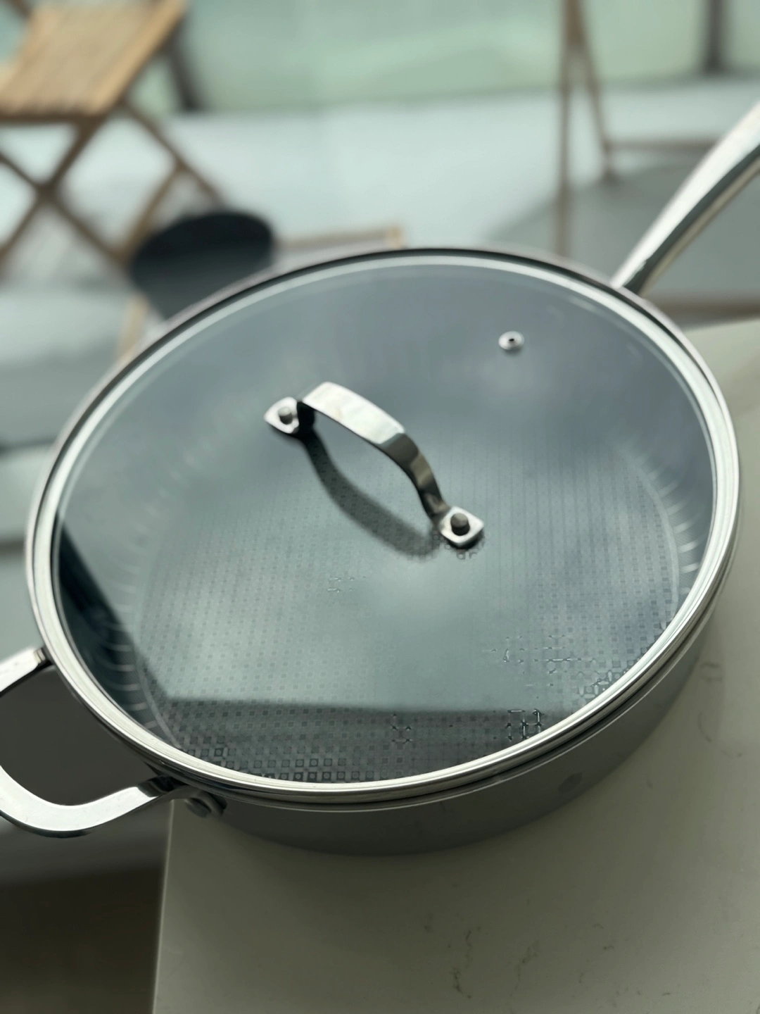 Stainless steel frying pan. Diamond non-stick. Three-ply construction. Includes glass lid. Professional cookware.