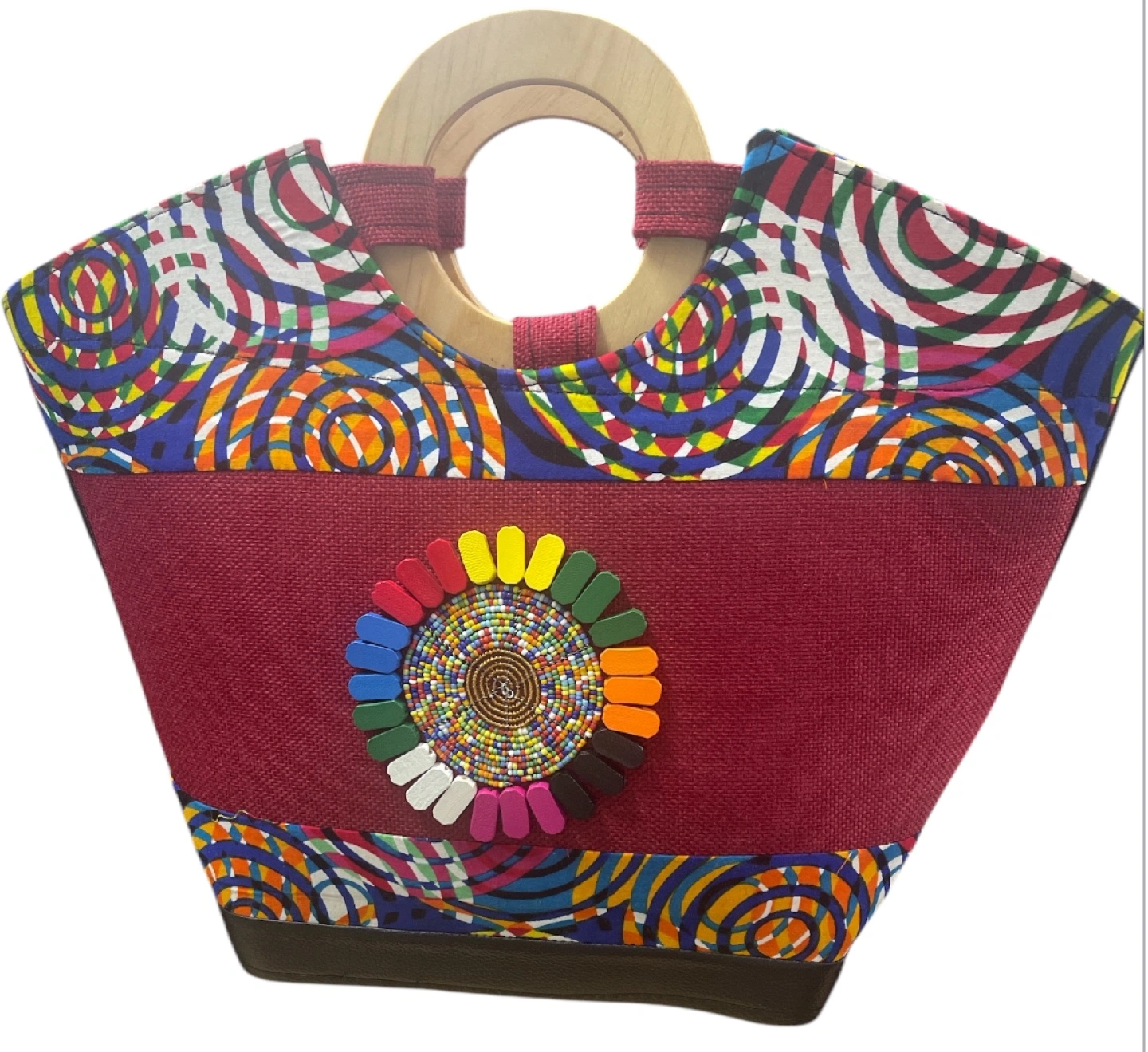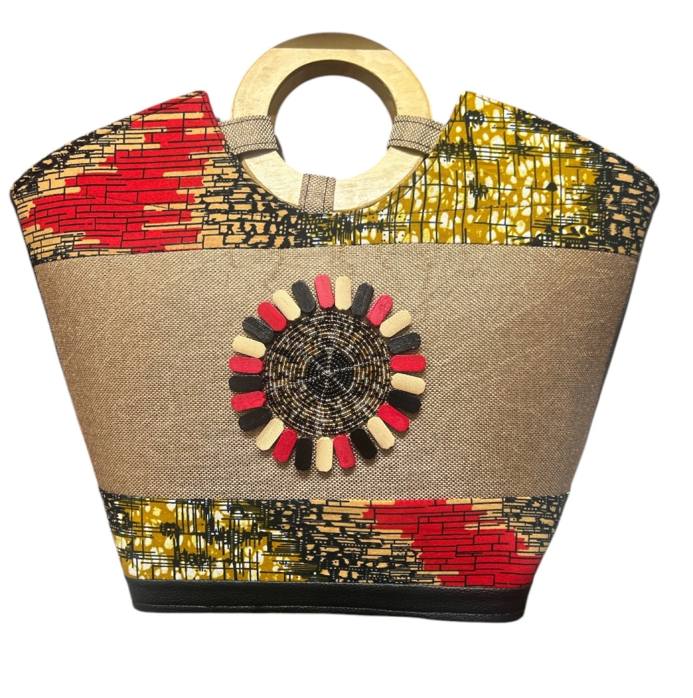 Unique tote bag. Features vibrant African print fabric, beaded flower accent, and a sturdy wooden top handle. Perfect for summer outings or everyday use. Large capacity.