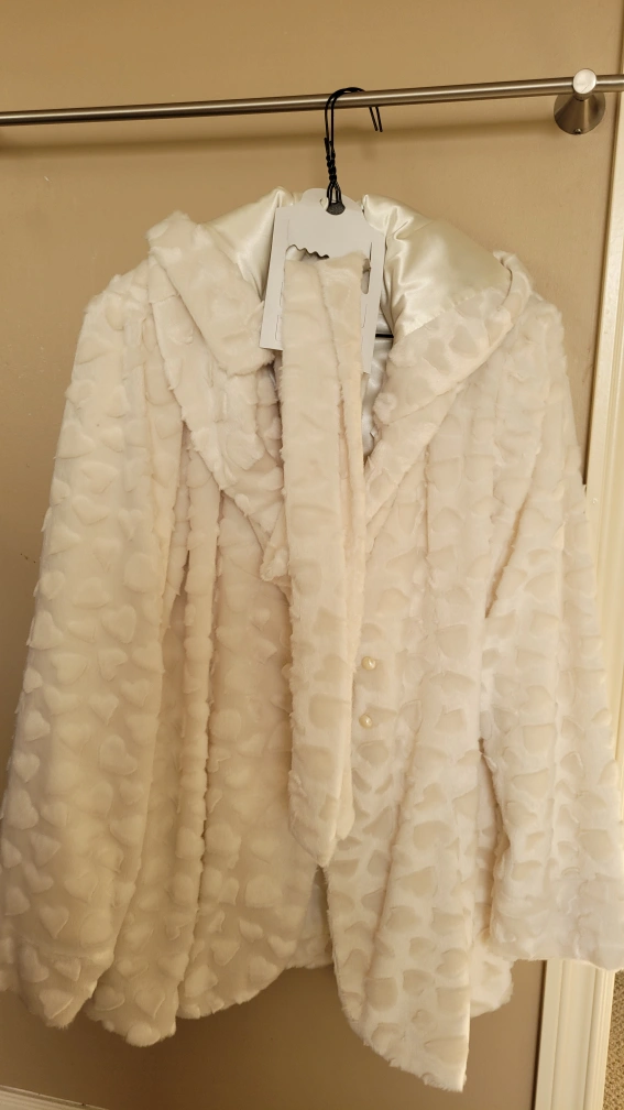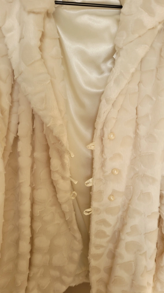Women's cream-coloured faux fur coat. Features a hood and satin lining. Button closure. Looks cozy and stylish.
