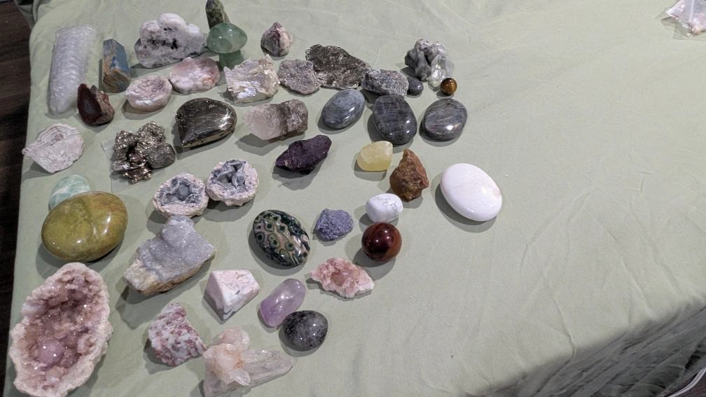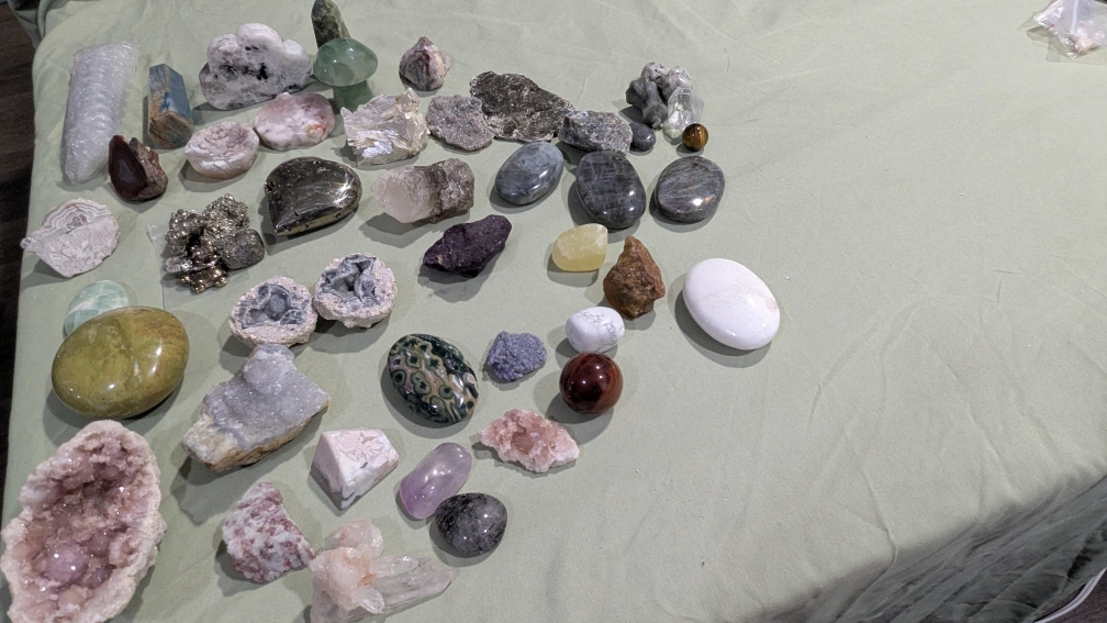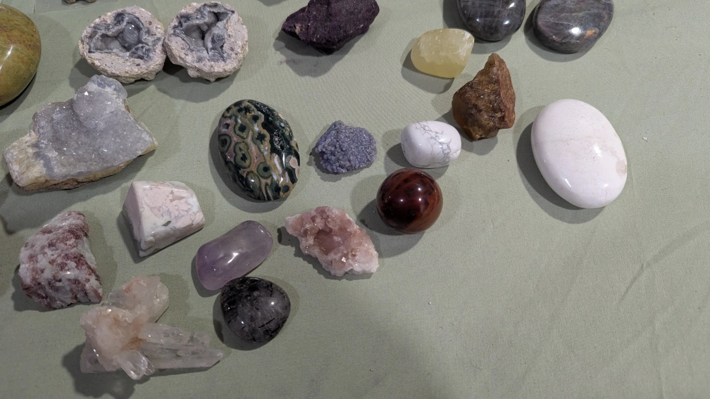 Various crystals and minerals for sale. Includes geodes, tumbled stones, and raw specimens. Many colours and types. Great for collecting or metaphysical purposes. I have similar listing for to smaller crystals, please make a fair offer as I am decluttering. I can sell all my crystals for fair price.
