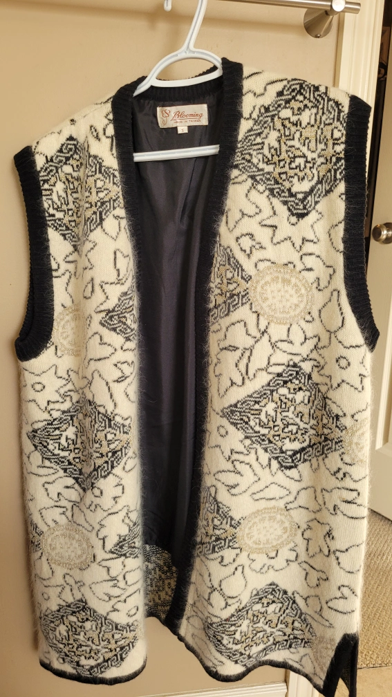 365Women's sleeveless sweater vest. Cream coloured with black and gold pattern. Open front. Size L.