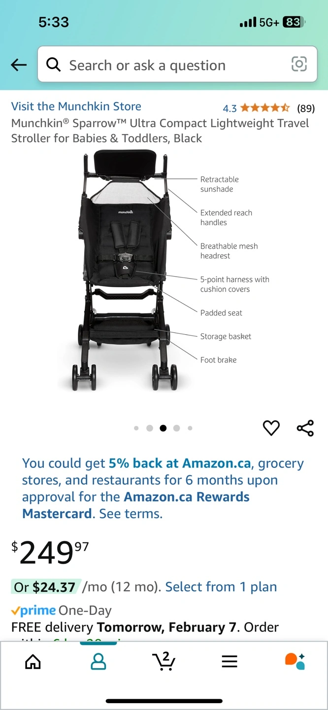 Ultra compact and lightweight travel stroller. Suitable for babies and toddlers. Features include a retractable sunshade, extended reach handles, breathable mesh headrest, 5-point harness with cushion covers, padded seat, storage basket, and foot brake. Folds easily for travel.