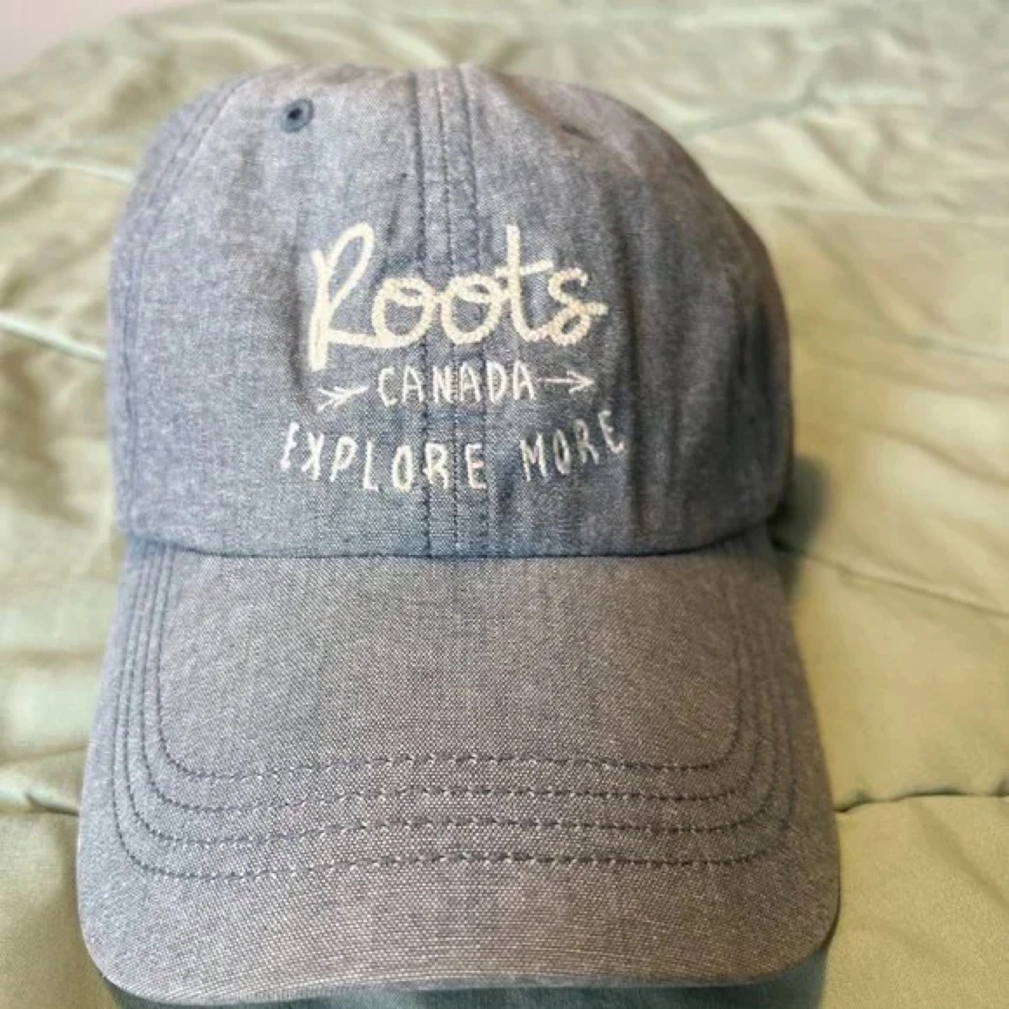 Grey cotton baseball cap. Features embroidered Roots logo and Explore More text. Adjustable strap.