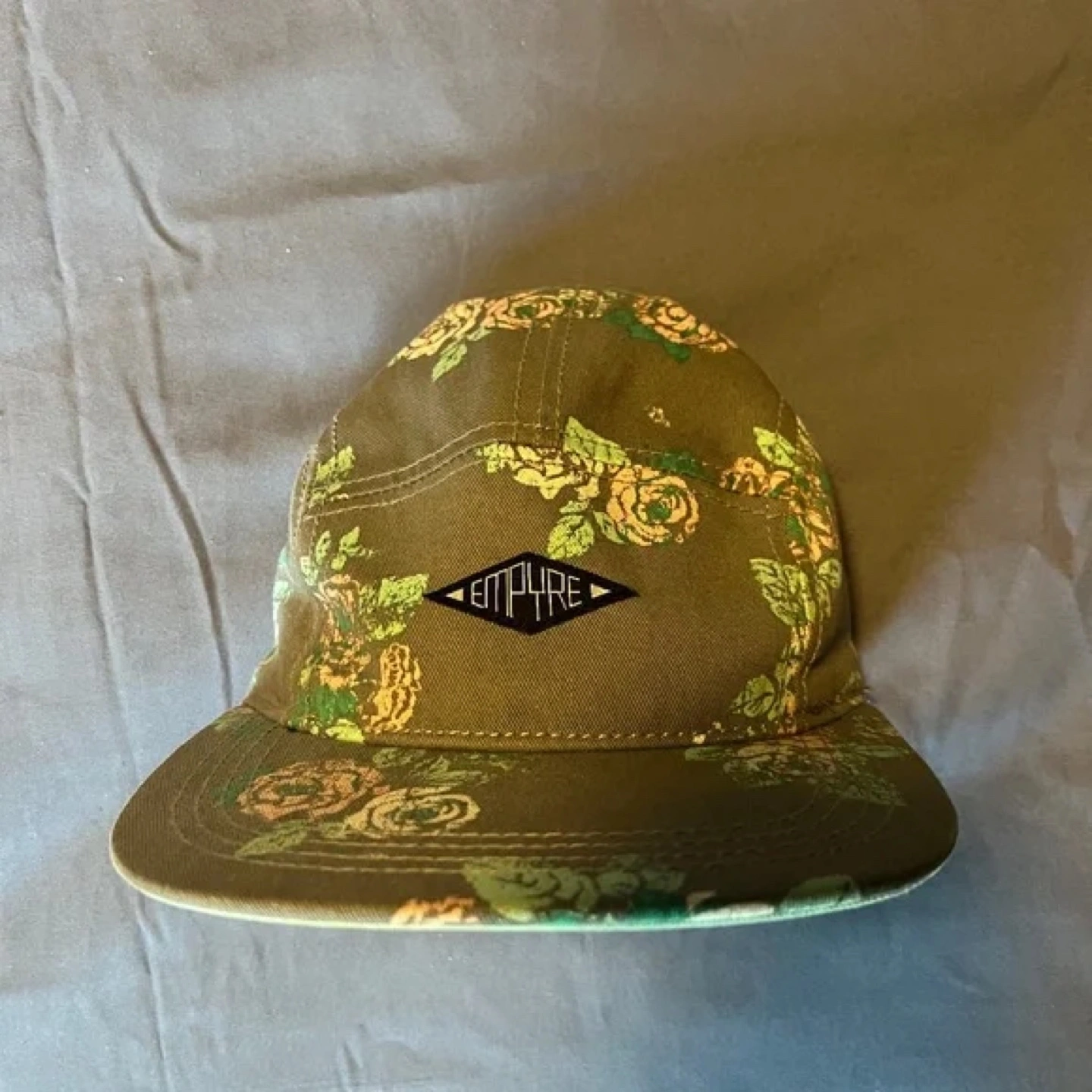 Olive green 5-panel hat. Features a floral pattern and an Empire logo. Adjustable strap.